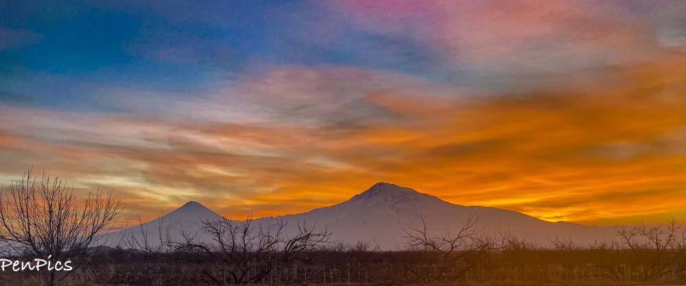If we can’t get where we want to go, due to snowy road challenges, we will get to where we can! I would like to show you this photo, first up. I took it with my iPhone after we walked out of the dining room, after we ate dinner last night. This is a sunset photo, behind Mount Ararat.