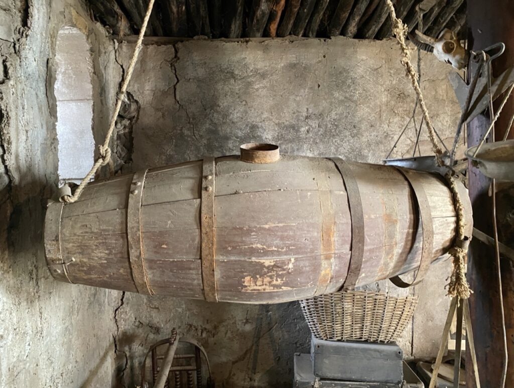 This barrel is set up on a swing. It churned butter, and yogurt