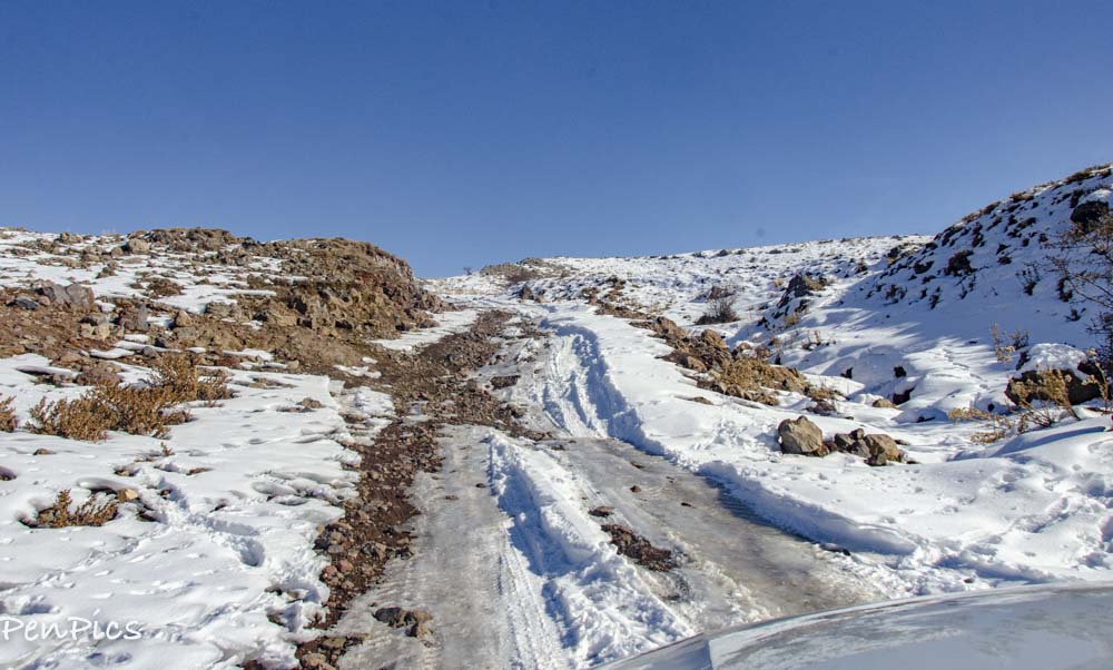 We made it far enough this time, to realize the barely and bad road ended, and clearly one would need a 4X4, horse, donkey, or a long hike by foot, to make the rest of the 12 miles. Yes, there was snow and ice, still, but enough gravel showing through we could have kept on track, had there been at least the same kind of bad road.