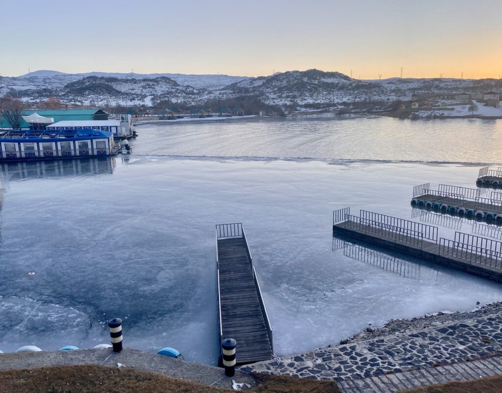 This part of the large lake is the only part we see that is frozen. Its in a small alcove below the restaurant where we are staying.