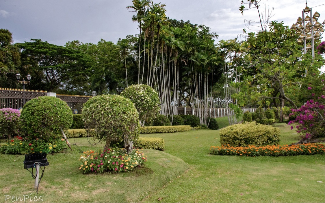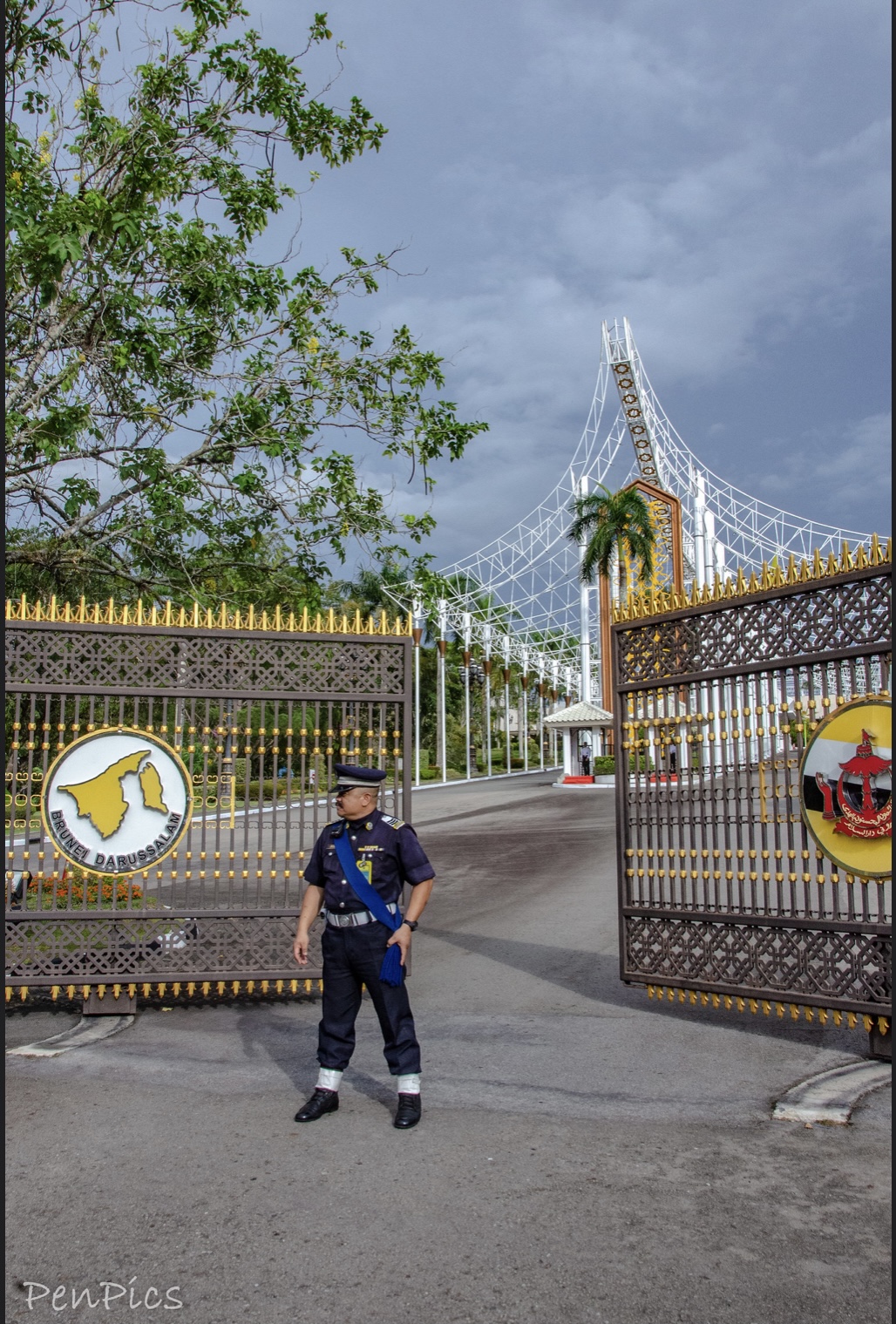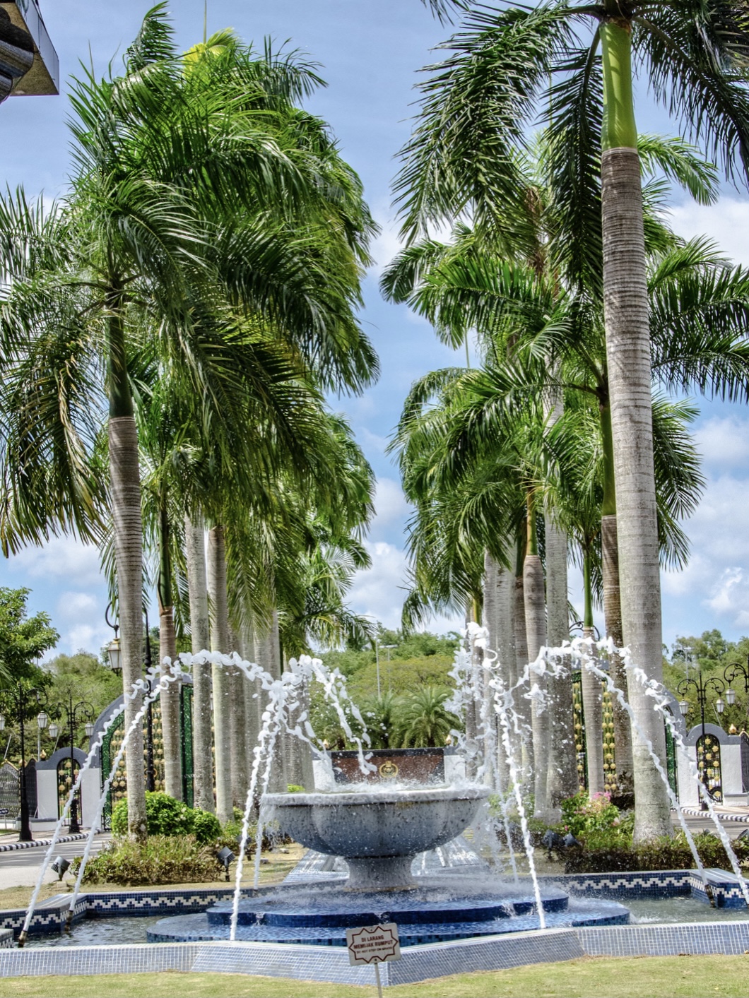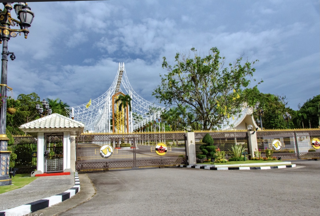 Palace entrance from the roadside; palace is named Istana Nurul Eman