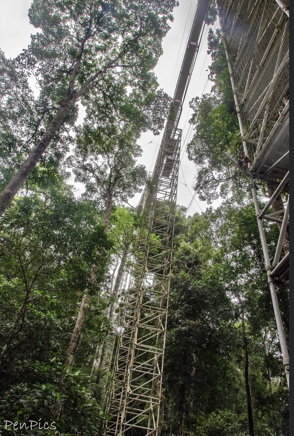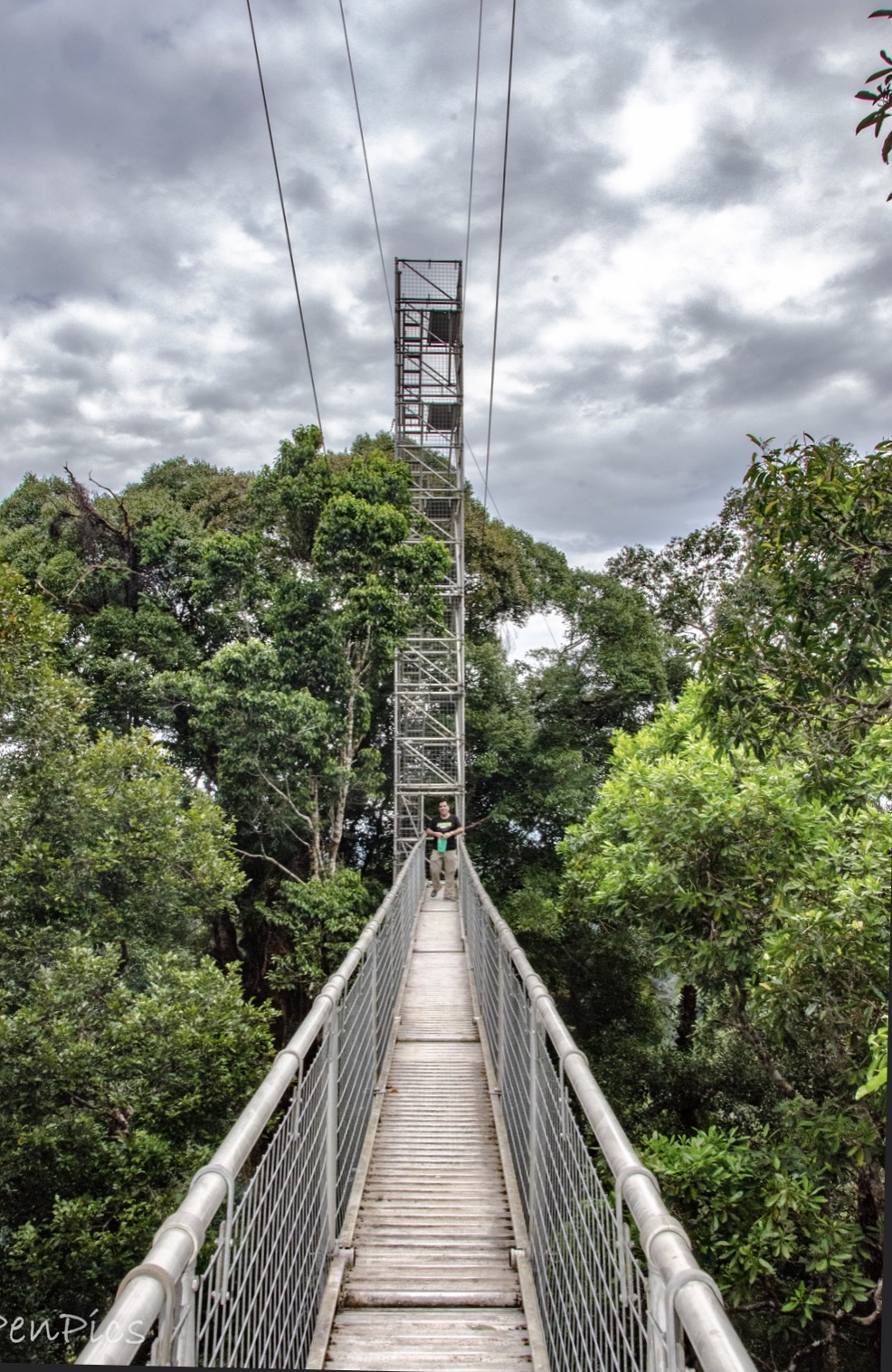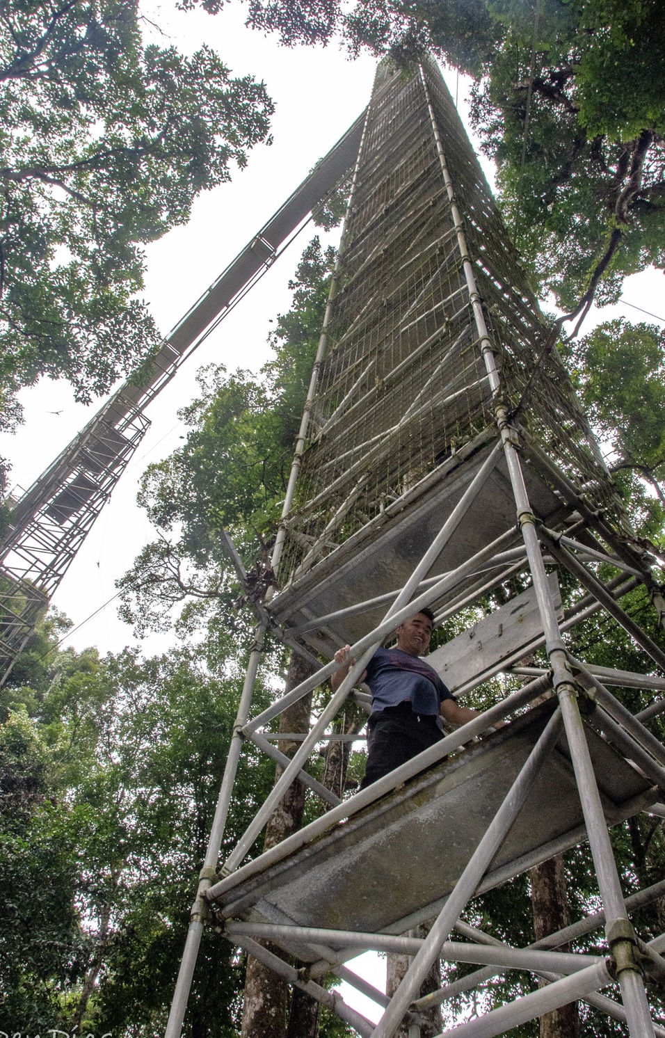 I finally made it to the canopy walk, and like others on the big trek up, was a little surprised, because there at the top of the stairs, was a massive metal structure that towered high above the jungle canopy. It was evident, as I watched others in the hiking group; there were mixed reaction after viewing such a monstrosity. Many expressed complete fear, and right away backed away off the trail, deciding not to climb the five level; over 120 feet-high tower.