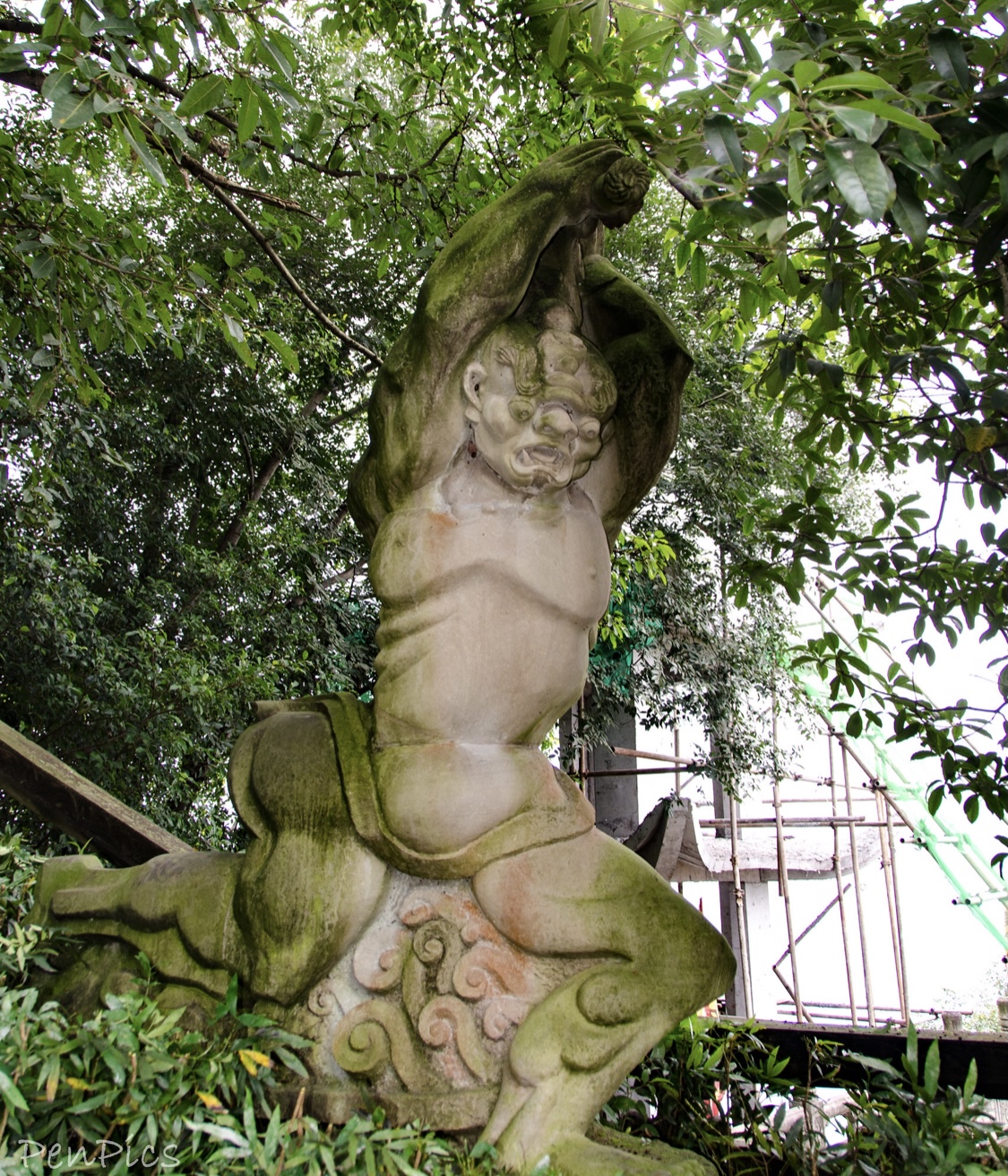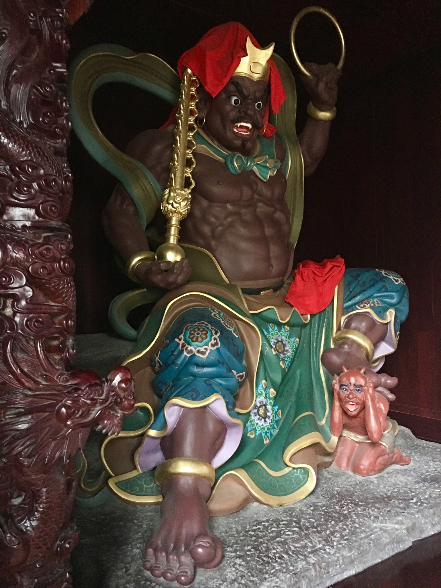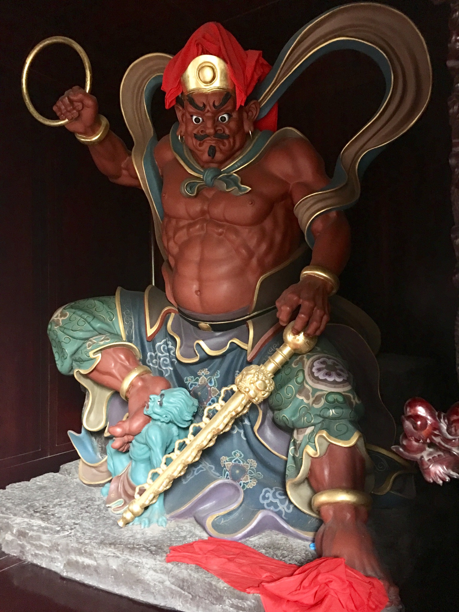 The Main Hall’s spirit wall is constructed of excavated Han Dynasty; 206 BC to 220 AD bricks. While inside the temple there are a series of statues to Buddist notables. The hall behind is dedicated on the right to general Zhangfei and Yan Yan of the Three Kingdoms, and on the left to General Qin Liangyu; 1576–1648 who fought bravely against the Manchu forces. A mural shows the Goddess Nuwa repairing the sky.