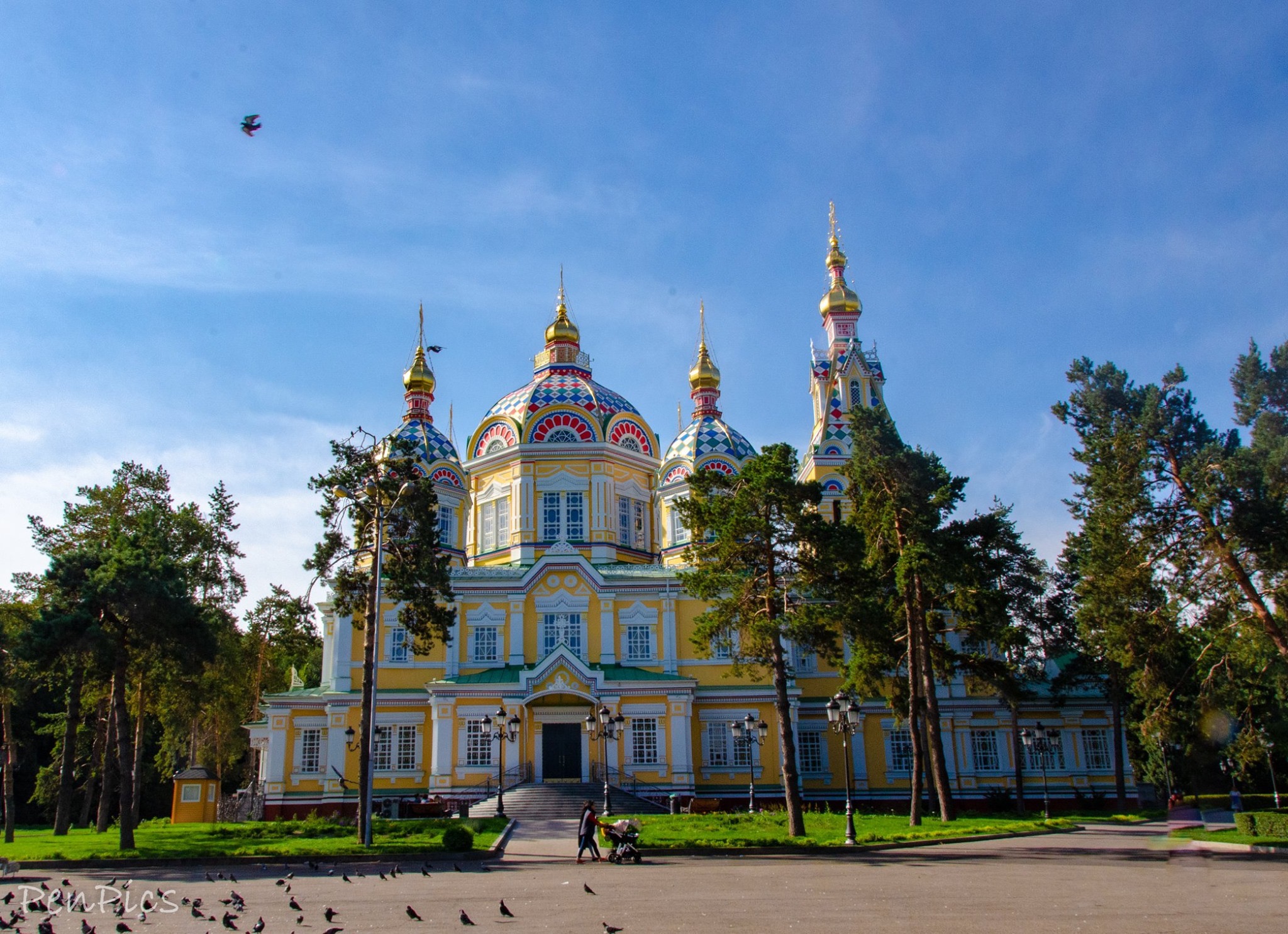 The Ascension Cathedral, also known as Zenkov Cathedral, is a Russian Orthodox cathedral located in Panfilov Park in Almaty, Kazakhstan. Completed in 1907, the cathedral is made out of wood but without nails. Its height is over 170 feet tall, and is claimed to be the second tallest wooden building in the world.