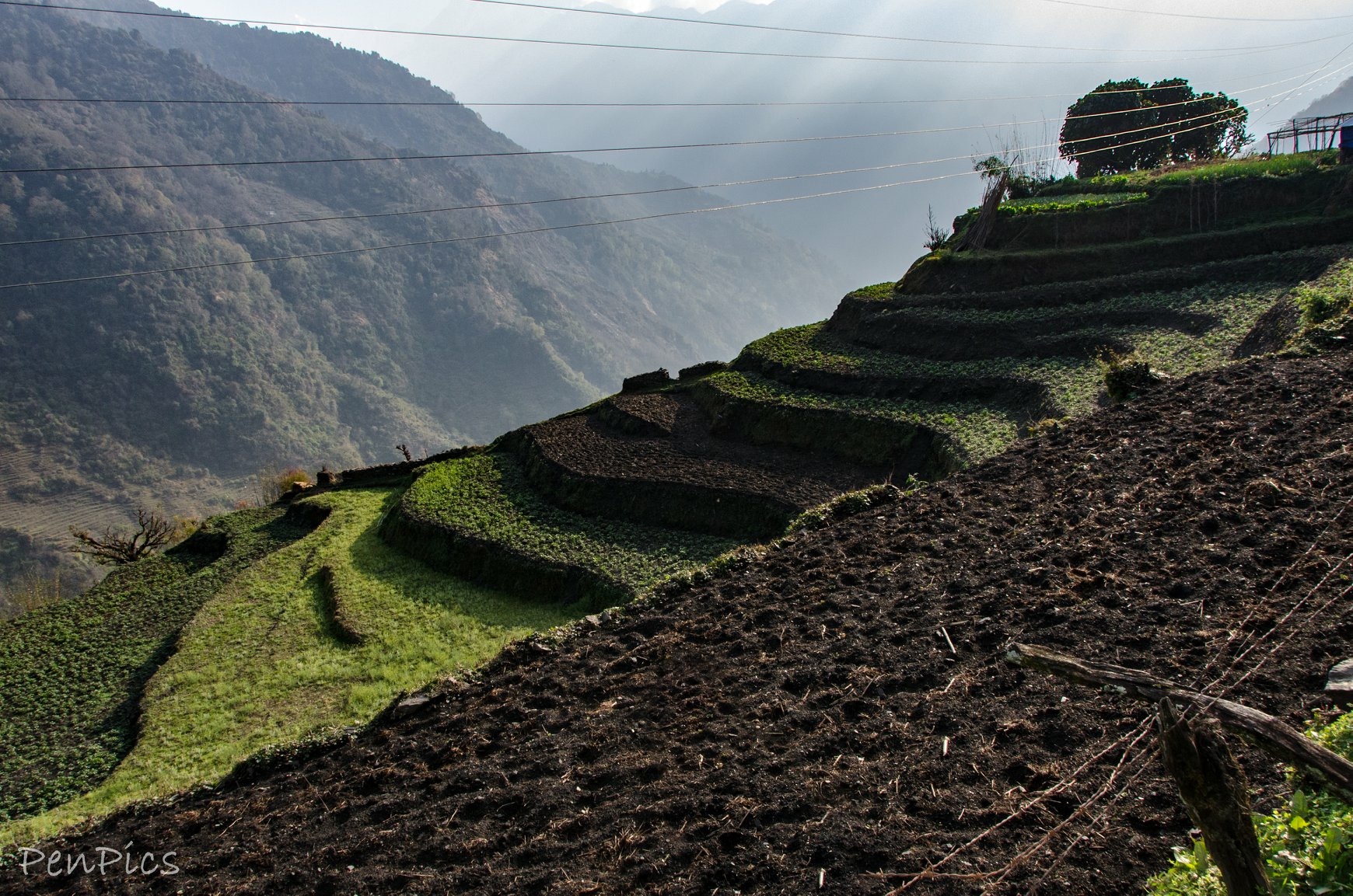 We did not rush our morning, but instead took our time; still recovering. I sat at the Tea Table with the warm morning sun on my back, drank some coffee, ate some porridge and used the WiFi (that was awesome) to work on my photos, and write. By 11AM, we were packed up again, and on our way out of Tadapani. This day was pre-planned to be a very easy trek. It was straight down the mountain, which would ultimately prove to include warmer weather, but it also took us away from those magnificent views of the Himalayas that felt so close, I could reach out and touch them. (this is a memory that will stay with me forever). In no time at all, (1 hour and 15 minutes), we reached Chuile, which consists of a few scattered farms, where we stopped to rest.
