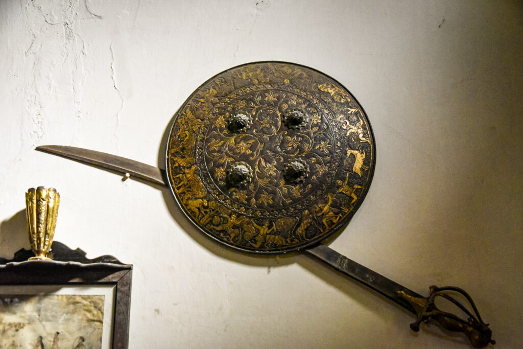 A sword and shield was the original for the king of the palace we visited and this family man-made the statue of that king and used the sword and shield to make the mold for the statue.