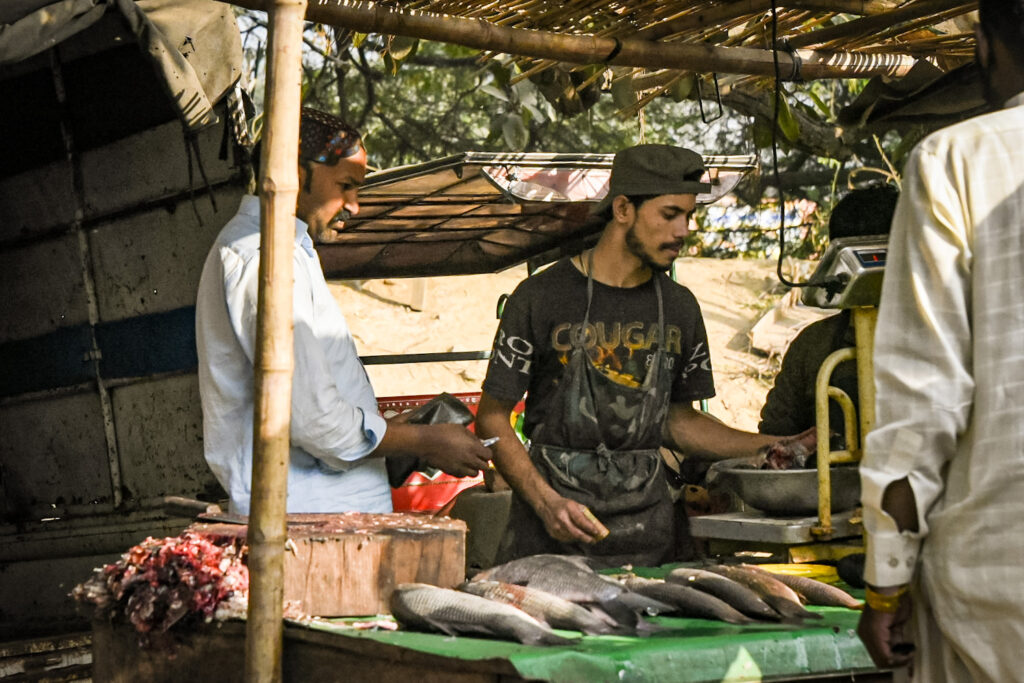 It is market day and the fruit and BBQ corn filled carts, many pulled by donkeys, have the masses lined up. The fruit, stacked high and brightly colored, add order to the daily chaos and the dingy surroundings. Smoke rises from the nut carts and food stalls. Carp lay in a row as the fish mongers cut them into filets. The flies learn fast to land on the guts and forget about the whole fish. One day to live, can you imagine the learning curve.