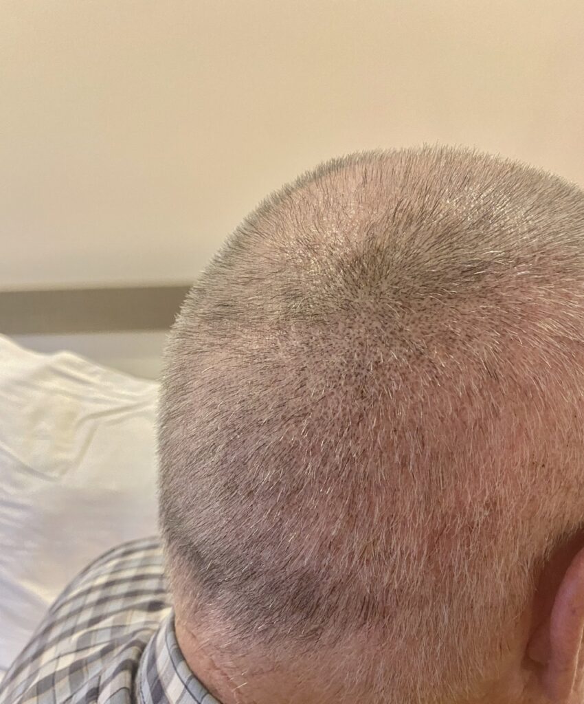 His harvested hairs on the back of his head are growing back with gusto. The sides of his head are coming back slower, from the harvest. The implanted hairs are growing as expected, so bald spots are disappearing. I notice, especially, his hair line is back in front, and his back bald spot is filling in. On top, there is a mix of grey and darker hair, so the grey hair is there, just not as dark, so it does not look like it is filling in, but it is. It will take time for that area to be thicker. He definitely has new hair, where there once was none! This is still a six month journey to allow the hair to get the regrow going, and a year for final results.