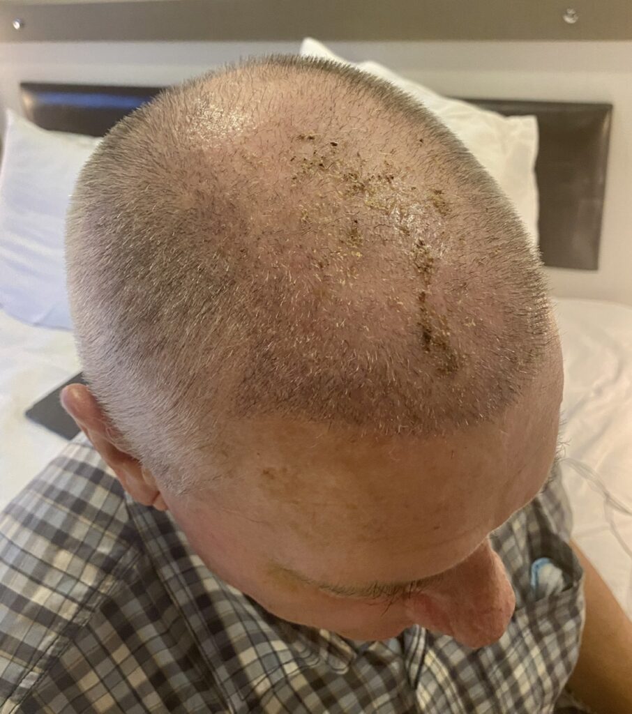 After ten days, there is no more requirement for lotion foam sprays or special shampoos. That’s progress. The antibiotics are finished as well as circulation meds, and meds for anti-swelling. His head shape has returned to normal. He does say his head feels numb to the touch. I never knew a numb skull was real thing! 😂