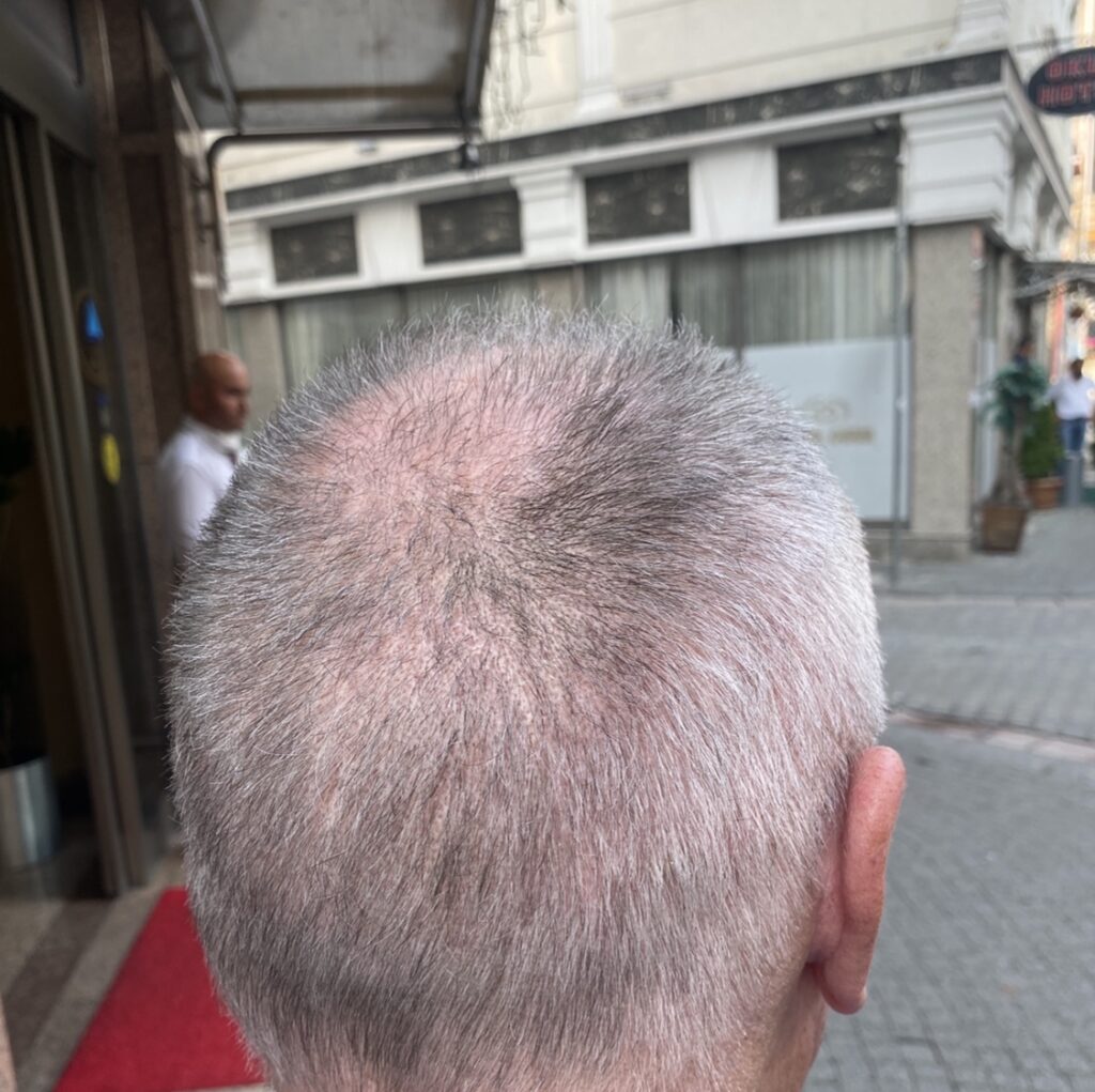 Daryl discovered his hair was falling out! This is a bit hard to swallow, but it is okay and part of the long process of hair growth. By now, Daryl is experiencing the “falling-out” phase of his newly implanted hair. This new hair growth is called “Baby Fluff.” The hairs are still weak and the body rejects them. This, again, is completely normal. The number of rejected transplanted hairs depends on a few factors: blood circulation of the scalp, sensitivity of the scalp, the grafts, proper meds taken, and instructions followed. From what I can see, Daryl has way more than 75 percent of his implanted hairs still on his head. (4,800 hairs we transplanted) I notice the new hair is not grey or white; they are darker. Almost all the transplanted hair was dark, as it came from the back of his scalp, where his hair is still thicker and not grey, yet. Incidentally, the 10,000+ hairs which were removed (harvested) from thicker hair portions on daryl’s scalp have mostly returned, without issue, already.