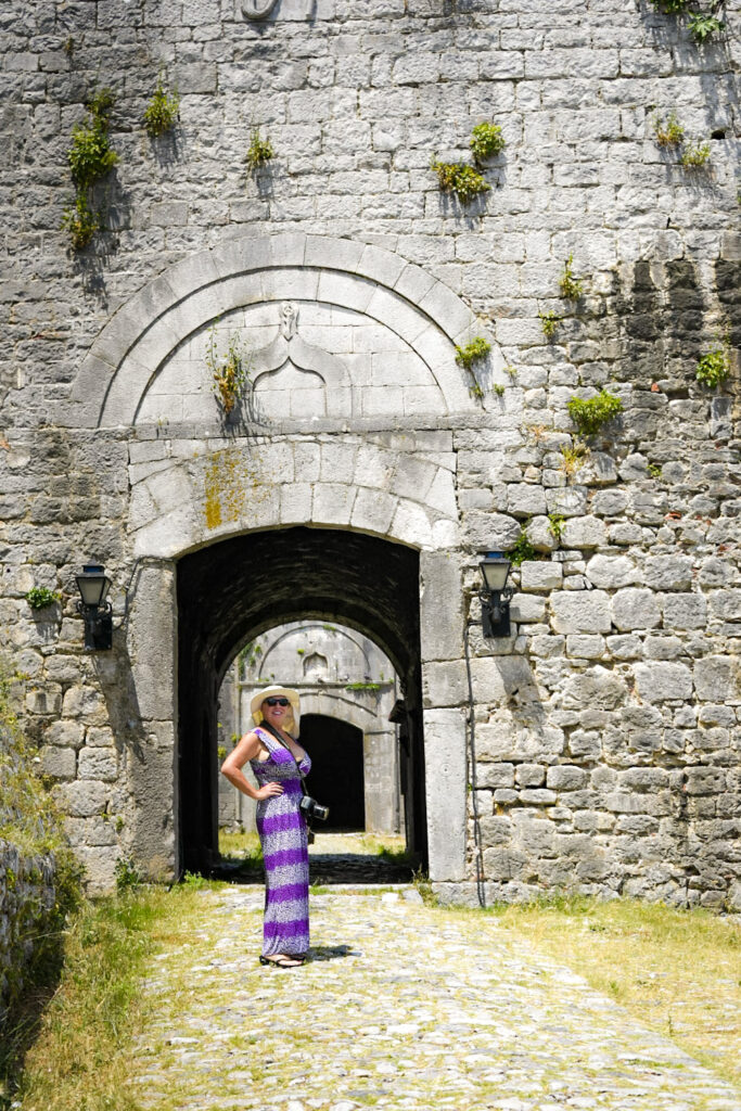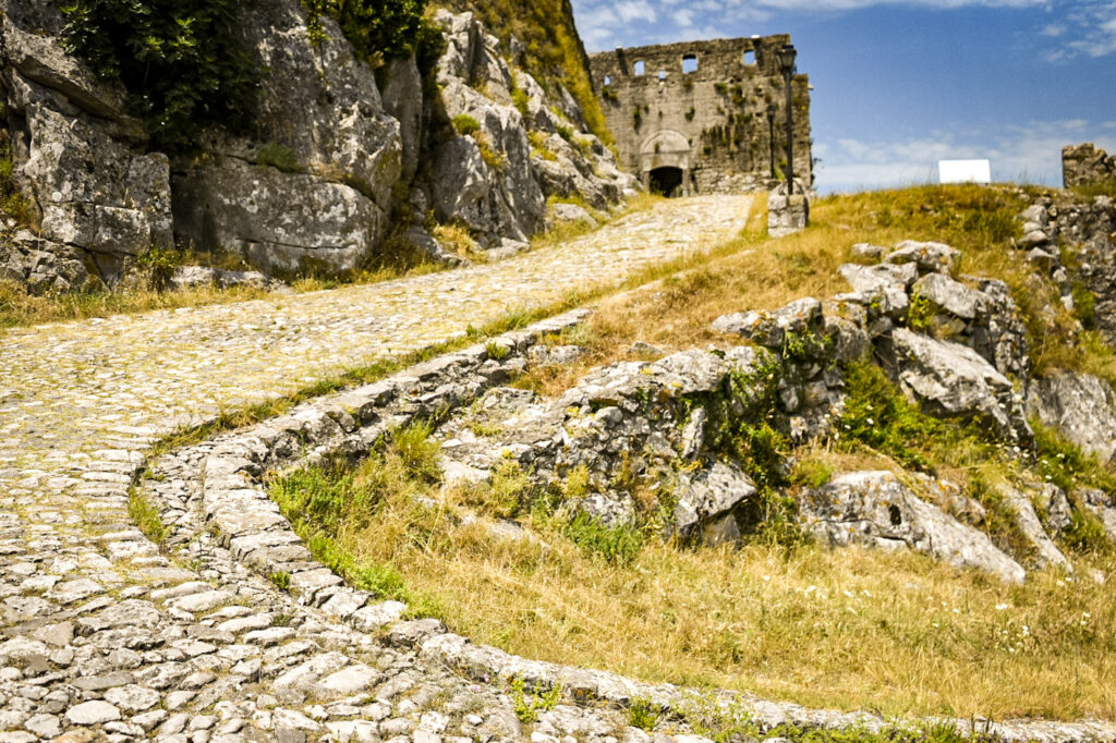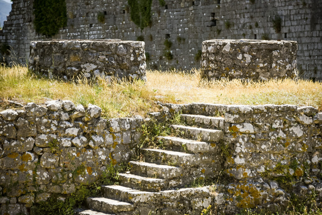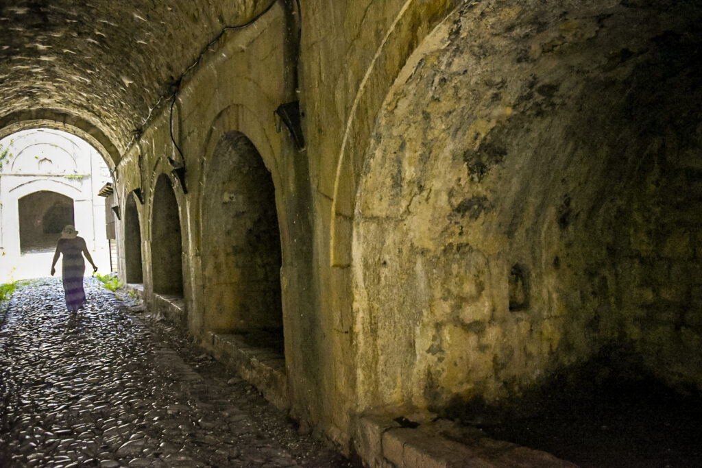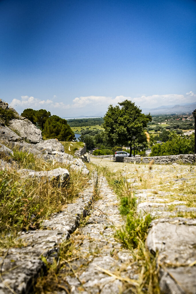 The hills are growing and popping up, randomly. The mountains up North are visible in shades of blue, as the haze filters a translucent image. High on a hill in town, is an old castle called, Kalaja e Rozafes. We climb a steep road with stone walls flanking the narrow road. These are remnants of the old village surrounding the castle. We enter the royal gates, past the old food stalls carved into the walls adjacent to the road into an arched tunnel. We pass several yards of the old village grounds. Then, we come to an ancient jail. Next to the jail is a church that later was commandeered into a mosque during the Ottoman era.