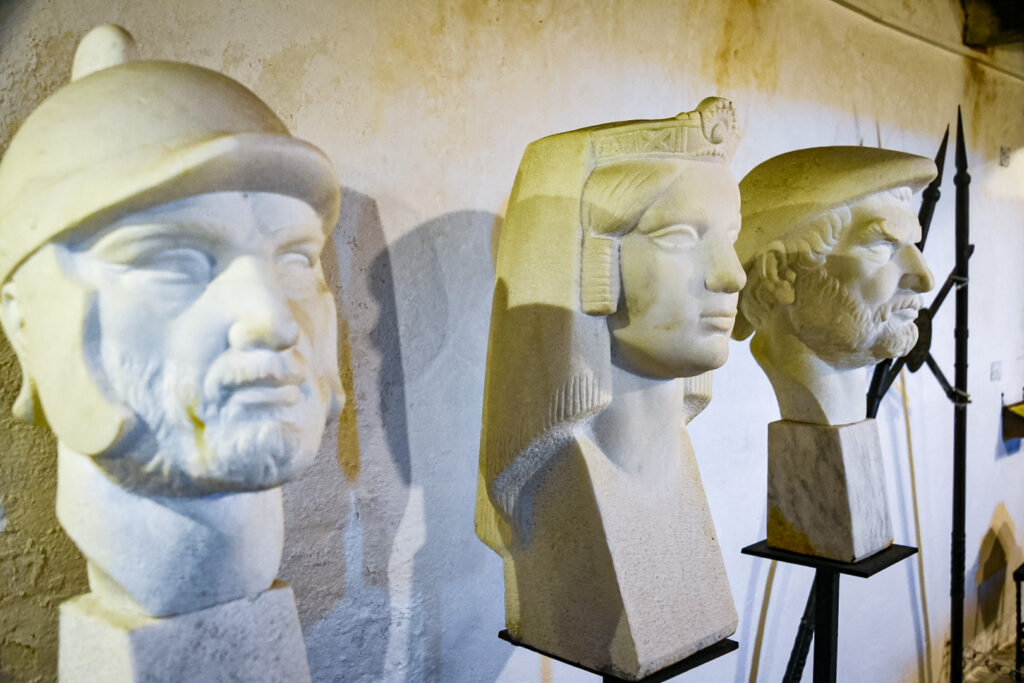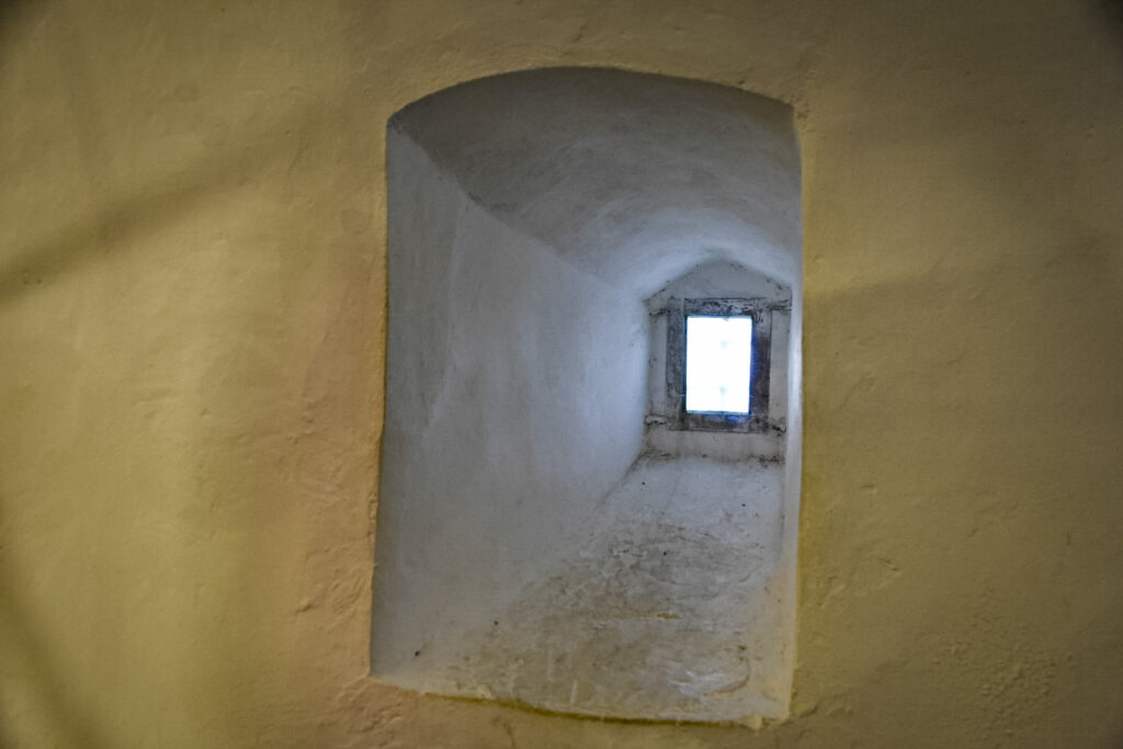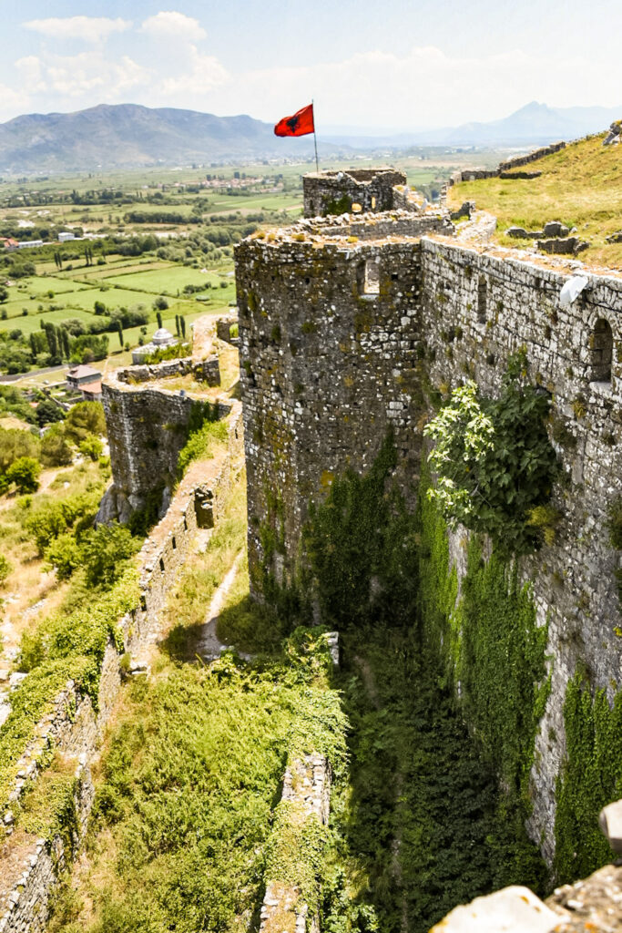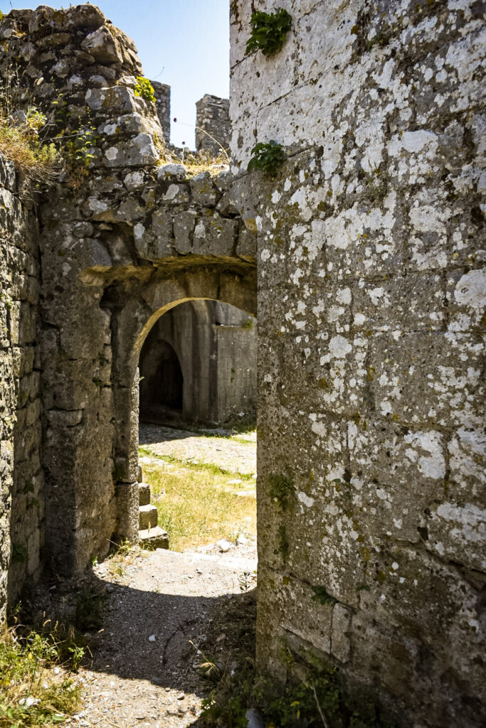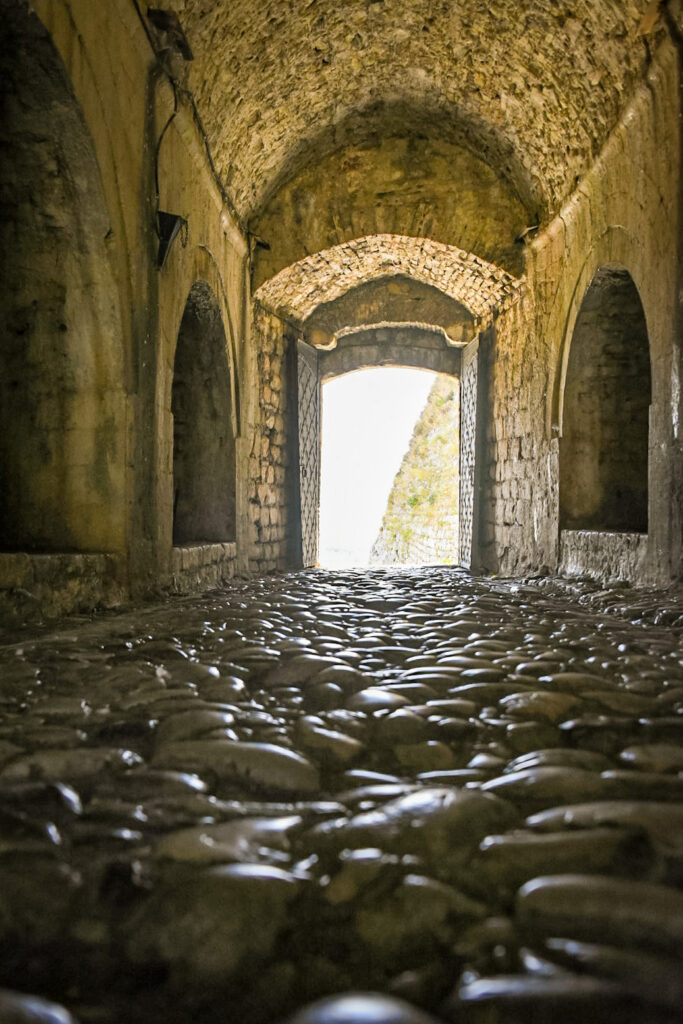 The hills are growing and popping up, randomly. The mountains up North are visible in shades of blue, as the haze filters a translucent image. High on a hill in town, is an old castle called, Kalaja e Rozafes. We climb a steep road with stone walls flanking the narrow road. These are remnants of the old village surrounding the castle. We enter the royal gates, past the old food stalls carved into the walls adjacent to the road into an arched tunnel. We pass several yards of the old village grounds. Then, we come to an ancient jail. Next to the jail is a church that later was commandeered into a mosque during the Ottoman era.