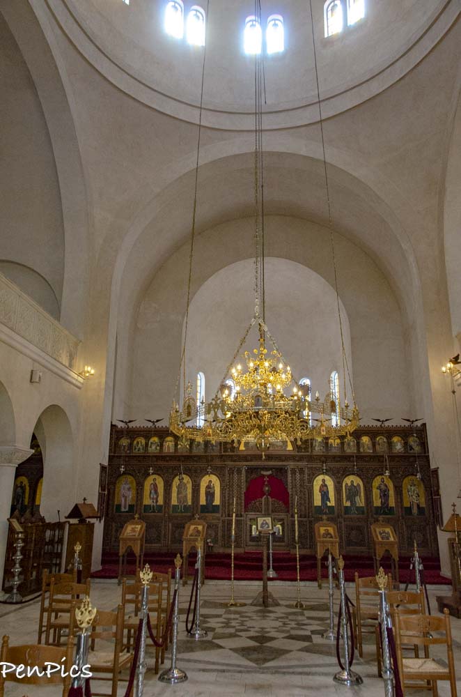 The entire upper part of the church is dominated by the burnished red color of Byzantine tiles, culminating in the dome. The restorations made in 2016 focused mainly on this iconic roof as it was the most damaged part of the entire construction. The gradual intertwinement of red brick with white stone as one moves downward toward the church foundations, gives the church façade an understated, elegant kind of beauty. From the outside, one sees its dominant reddish dome stretch over both sides of the construction, resembling a cross, lending a sense of peacefulness to the entire city below.