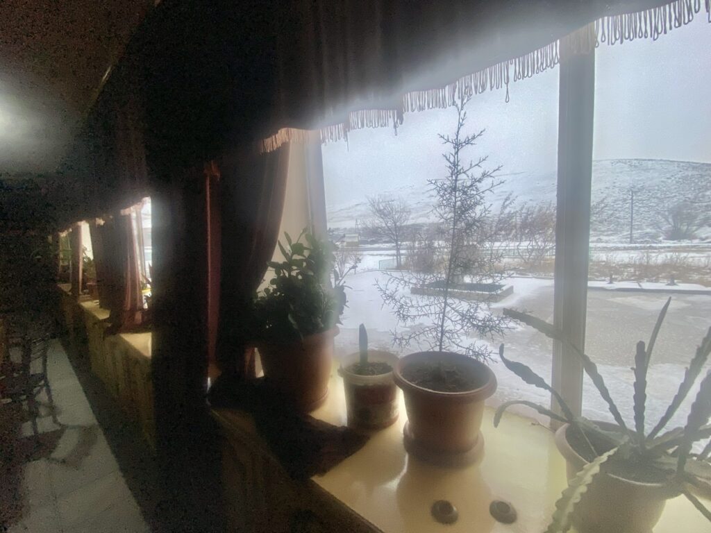 Next up, since we were so far north, we tried to make another attempt to get to Lake Apri and the National Park. We did well till the final hour of drive time, where we had to leave the better road, onto a side road. The snow and ice blocked this attempt, again! From there, we had no choice but to find a place to spend the night, as temperatures would be dropping. By no coincidence, we found this remote hotel/restaurant on the way back from the Georgia Border. It allowed us a stay in the rural area, thus avoiding going into the city of Gyumri, which would be snowy, but dirty, “in the city snow,” with no peacefulness.
