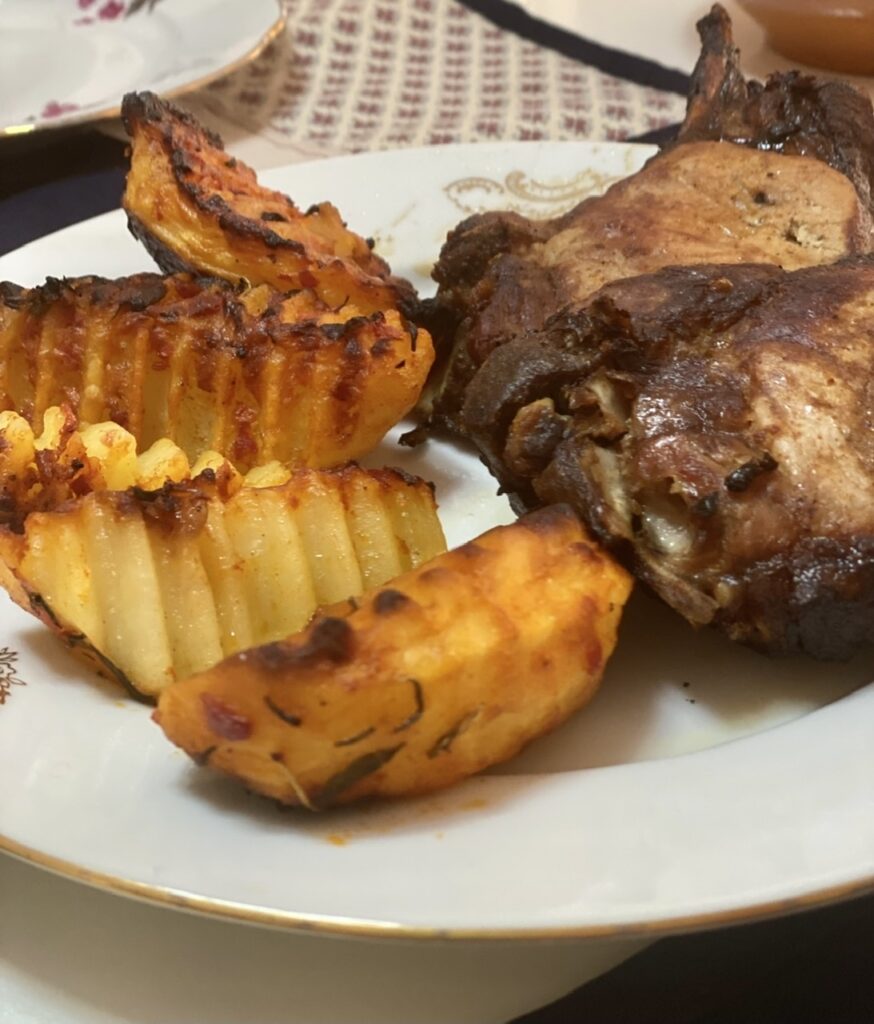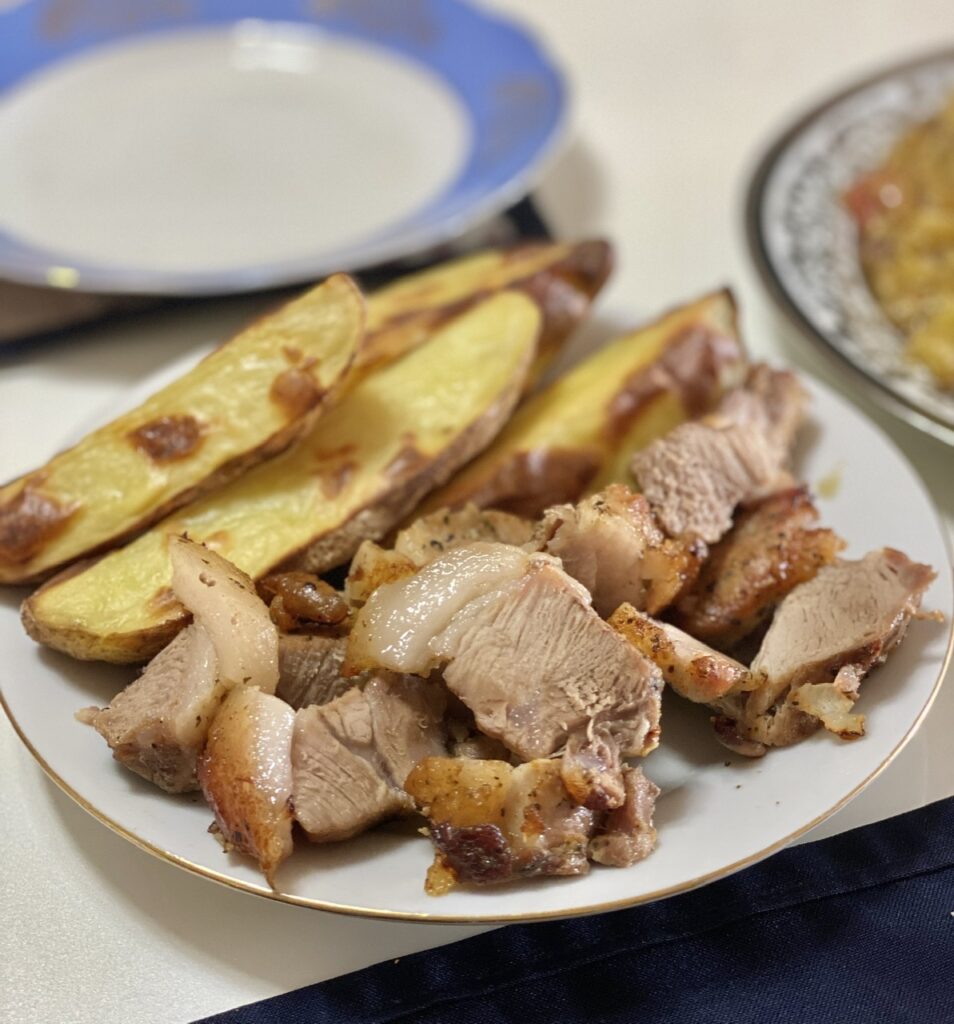 Our host asked if we liked Rabbit meat. Of course we do and we said yes. We always have our dinner delivered to our dining area at 4:30PM; which our time pick. About 10 minutes after he asked us about the meat choice for dinner, there he was out back in the large garden area and small orchard, under a covered shed. He was skinning a good sized Rabbit for our dinner, apparently from his own fluffle or colony. Now, you can’t get a meal any fresher than that! As always, the meal was delicious; all of it!