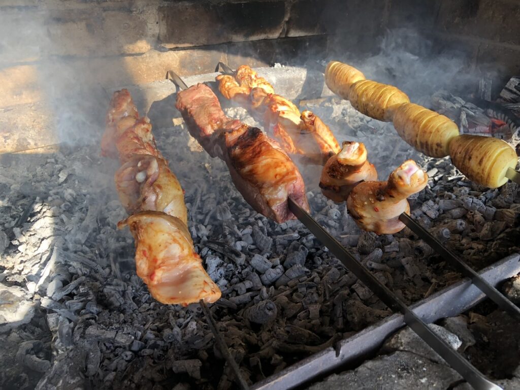 Shashlik is made usually with cubes of marinated pork meat, often with bits of vegetables. Shashlik is also grilled over hot charcoal using skewers.