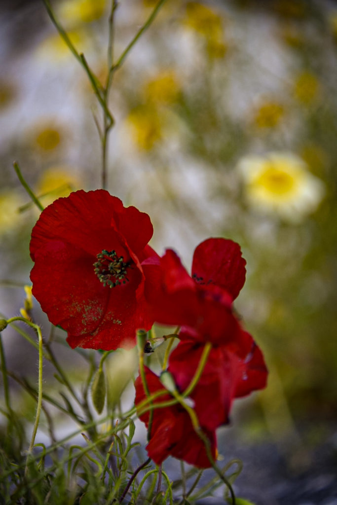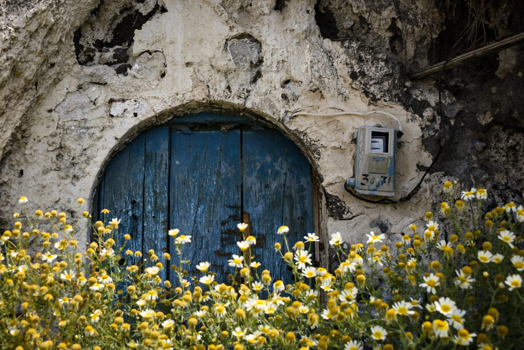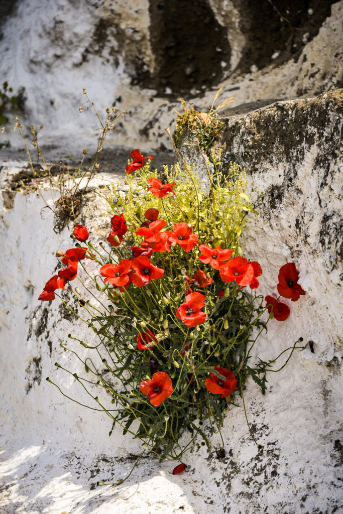 Few trees can survive the relentless winds that hammer the island on a regular basis, but the few that are there, are tormented pine trees, clinging to the edge of the steep incline, protected by the overhanging basalt ridge. Due to the lack of tourist traffic, flowers are growing abundantly in between the cobblestones, allowing them to go to seed. Red Poppies appear between the cracks on the wall.