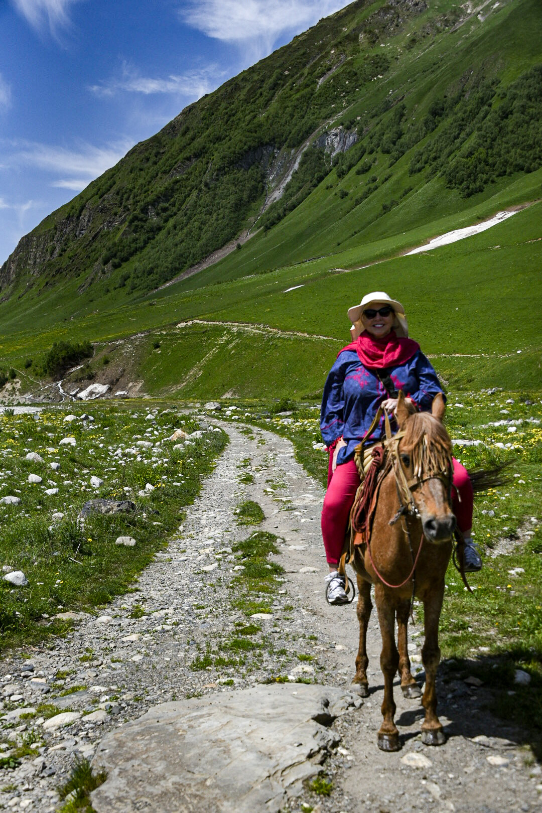 We took a couple of horses and a guide up another canyon with two young dogs who chased the cows and pigs and played all the way. Streams flanked both sides of the rock road with streams racing down steep mountains, white water foaming as it meets the river; many with snow on the North facing slope. The glacier ahead was almost all the way to our hotel a thousands of years ago. The Lamaria Church, a centuries old church was built on the moraines of the last ice-age glacier that stopped just before the church hill. Moraines are the accumulation of rocks that have been pushed along by the glacier and left as the glacier melts back.