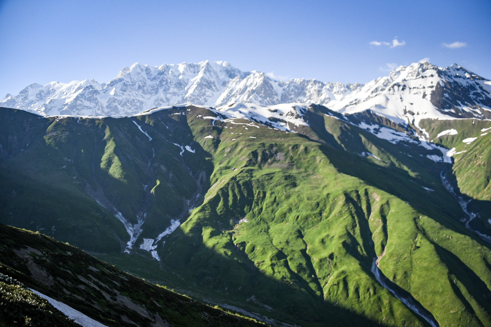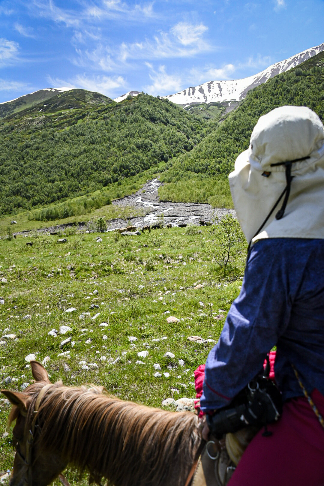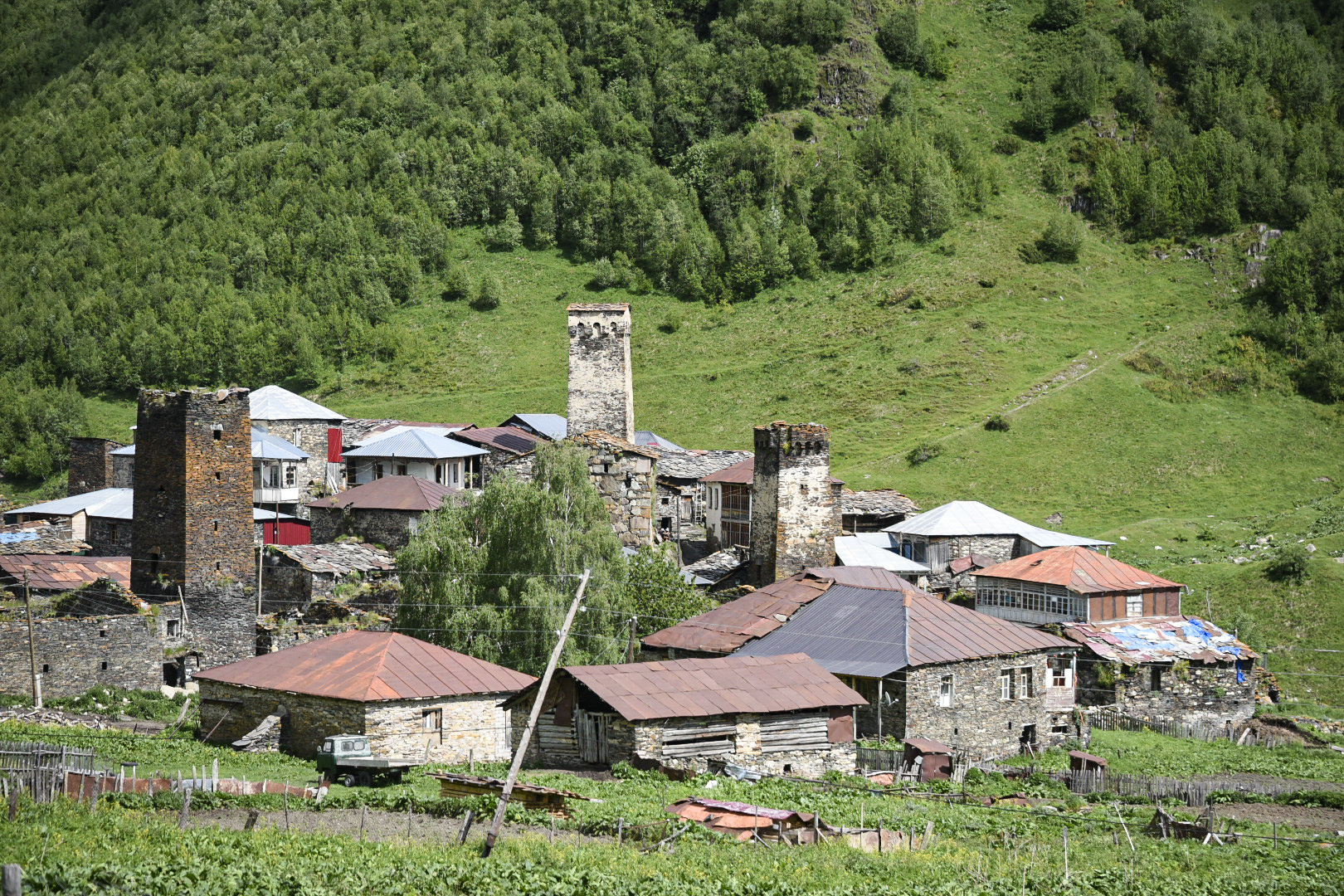 We wake up to a sunny day, and as we drove, we saw the trees sweep down from the peaks with grass that seems to flow out to the valley floor. There were snow white-caped mountains over above this small village of Mestia. The towers were all over the town and the next stop was a UNESCO site, with even more towers in the area.