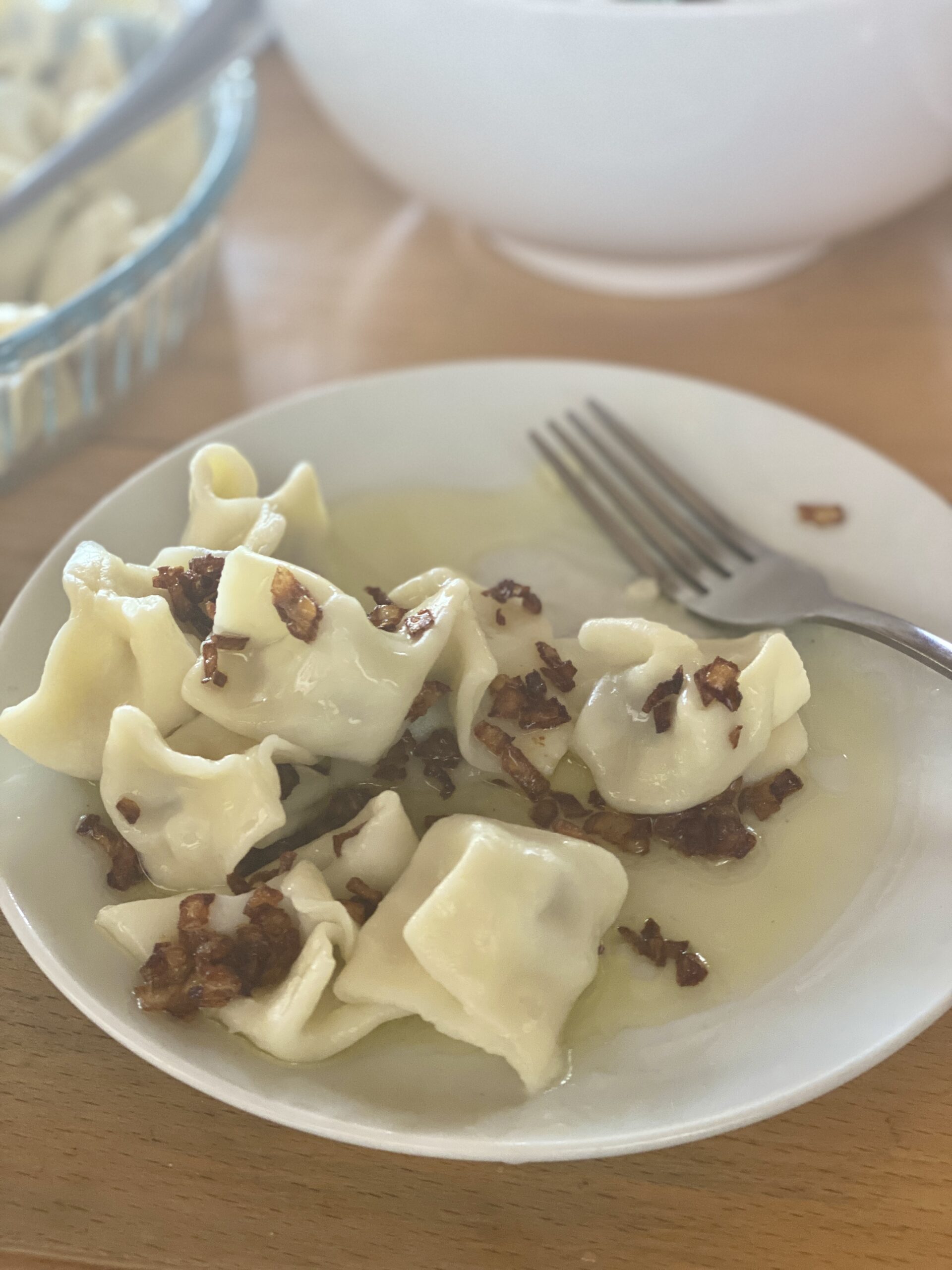 The other dish I have liked is another form of “dumplings.” ⬇️ This a not just a Georgian dish, but a Caucasus dish, made specific to each country. Yummy homemade pasta with a little meat inside. Various “dressings” come with the dishes. This one is olive oil mixed with crispy caramelized onions! Divine!