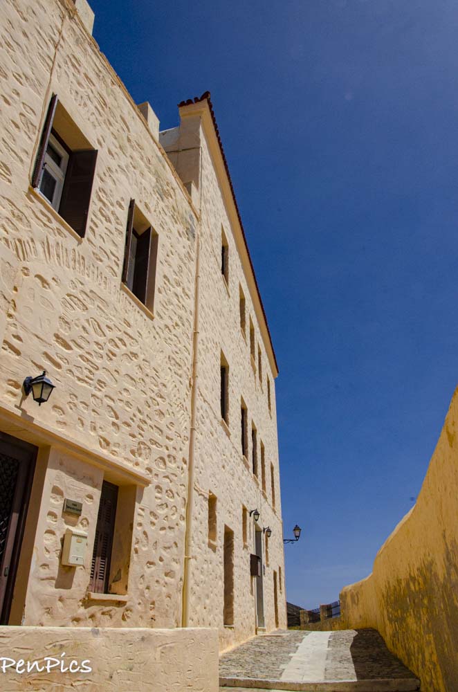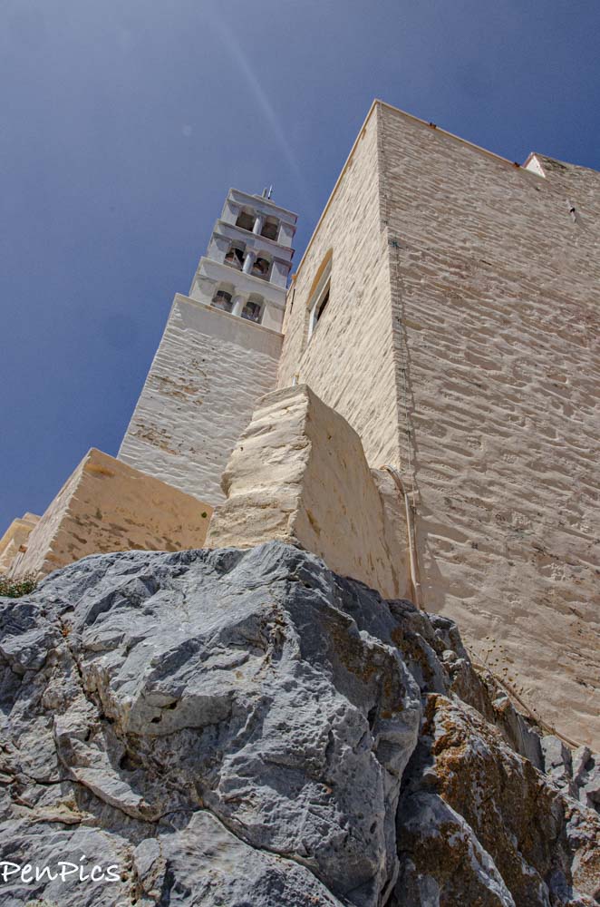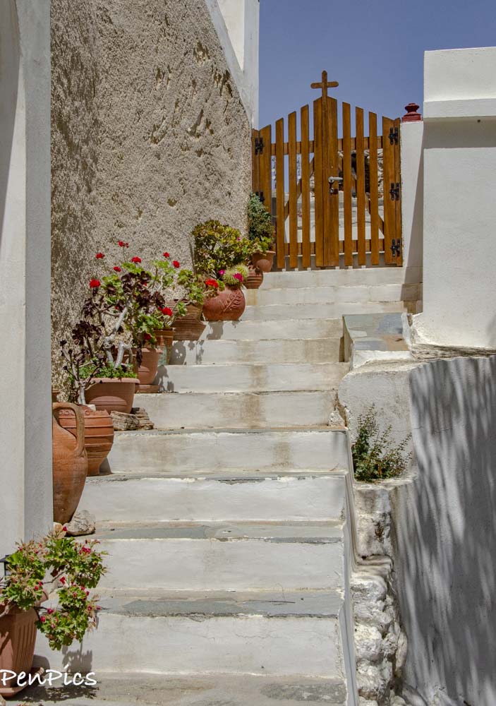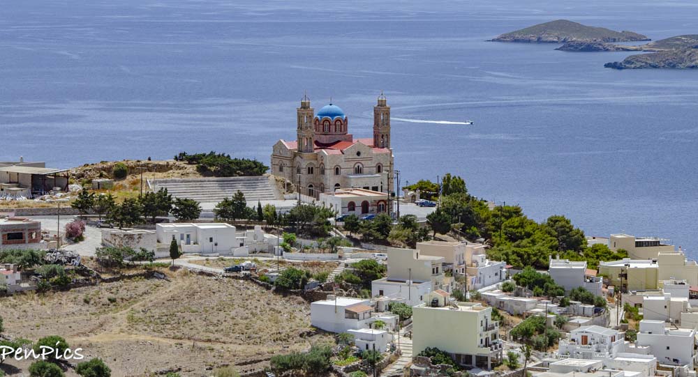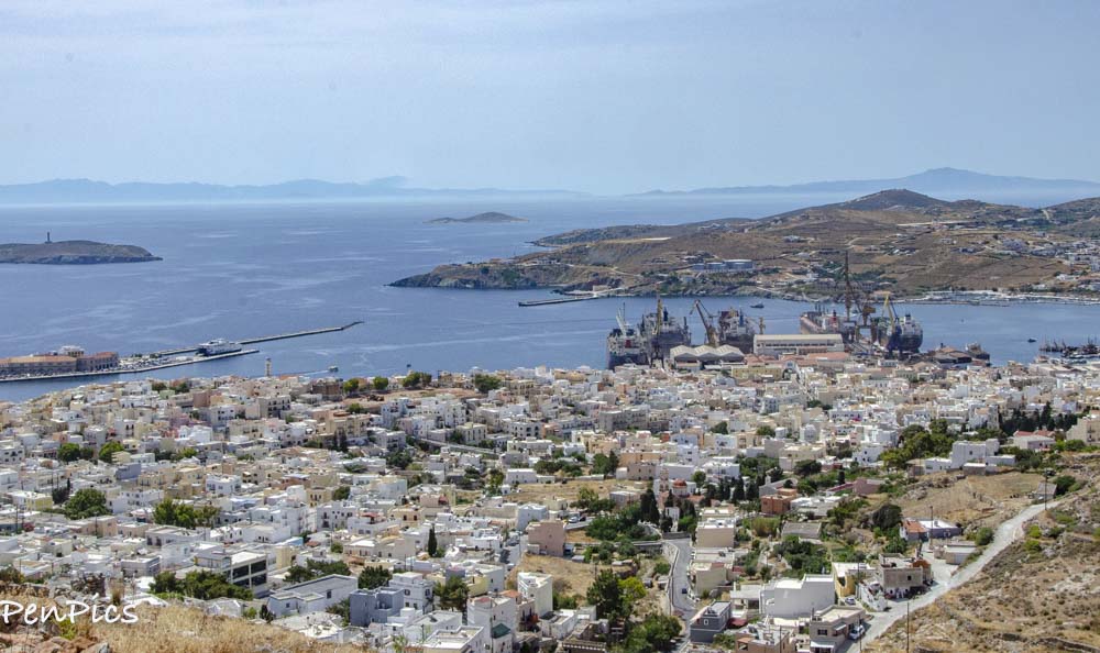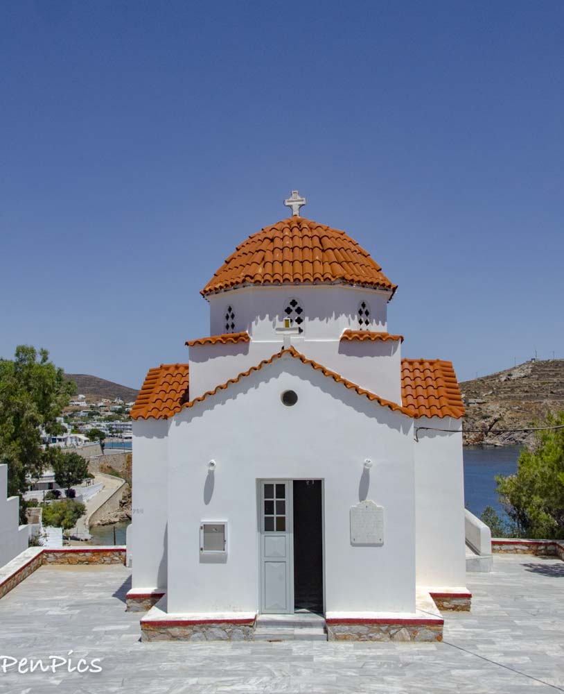 This morning, we hopped in our car and headed to the ticket office to buy ferry tickets, first thing. We will have an easy ferry ride of less than an hour, when we leave Syros, for Tinos Island. After that business was taken care of, we hit the hills to visit a church and a Monastery. Neither one were open for viewing, but the area surrounding them was quite lovely, with an old village to wander through, and great views of the port side of Syros.