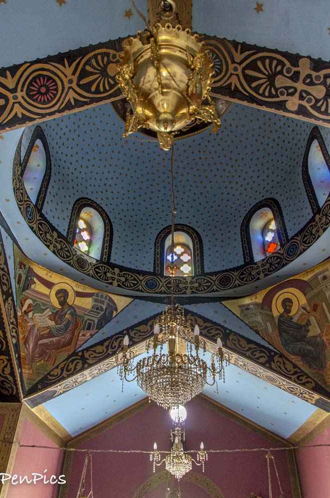 The imposing temple is a cruciform basilica with a majestic blue dome and two impressive bell towers (the bells constitute a donation by the Pangalos family, in 1905). The church has many neo-classical architectonic elements, which are apparent especially in its exterior, while the interior is rather wonderful, with marble being the dominant material. The church has numerous, magnificent icons, many of which are of major artistic and historic significance.