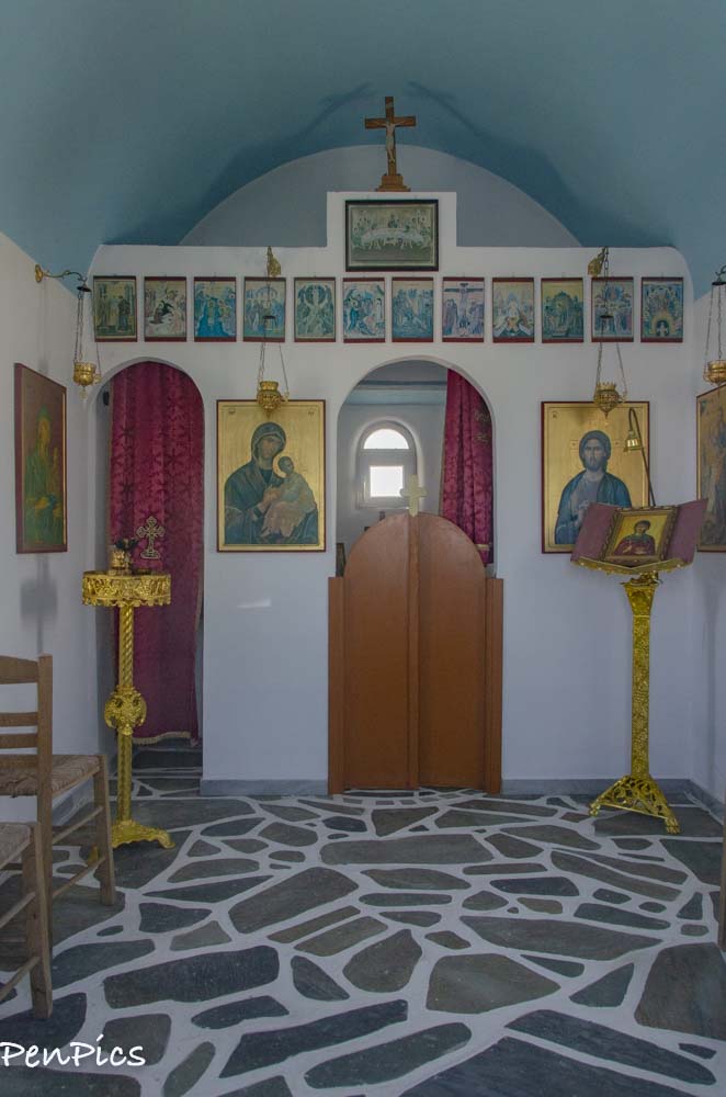 At the entrance of the cave, there is the white chapel of Agios Ioannis Spiliotis, built in the 18th century