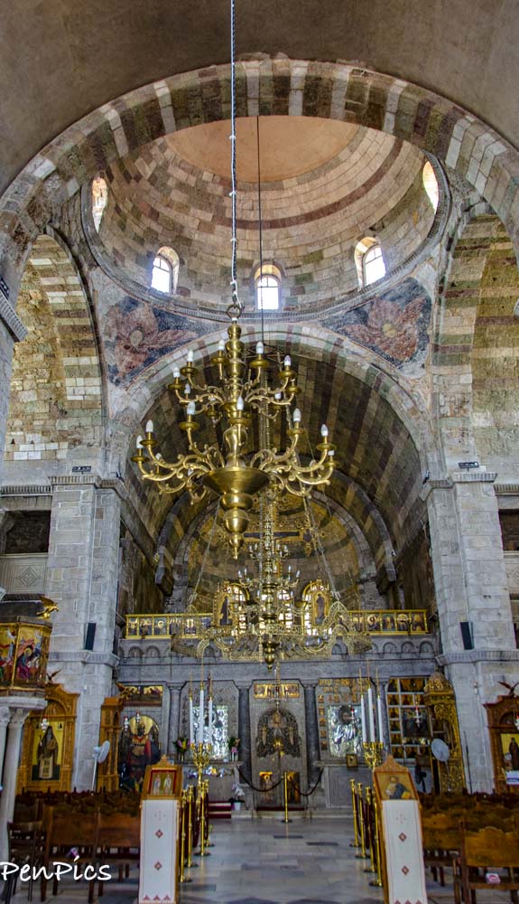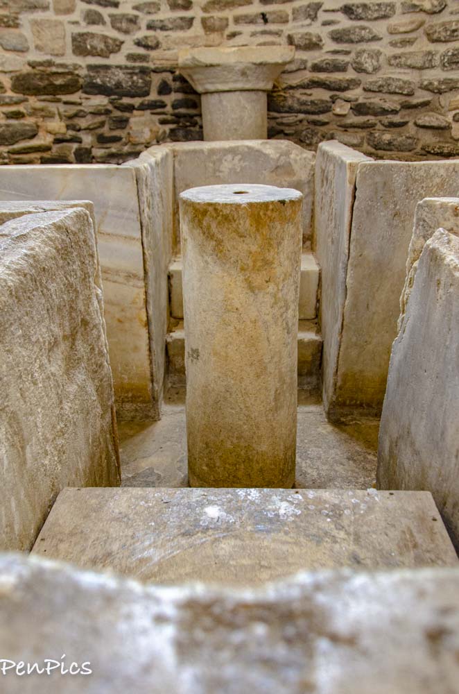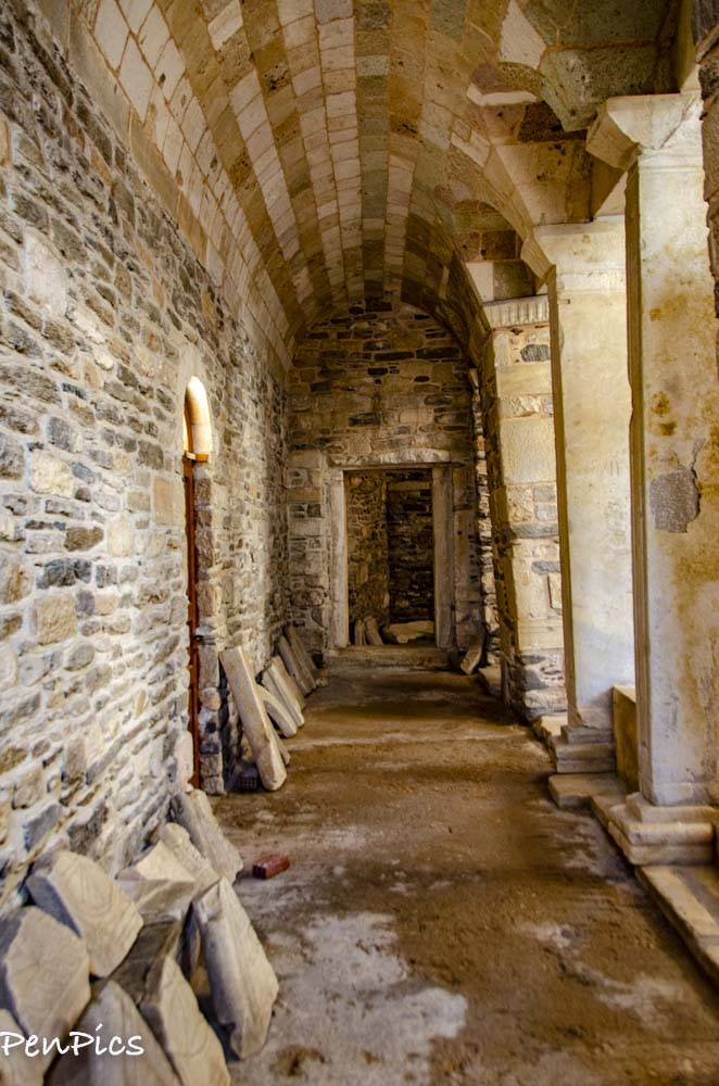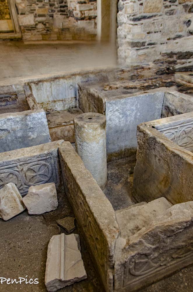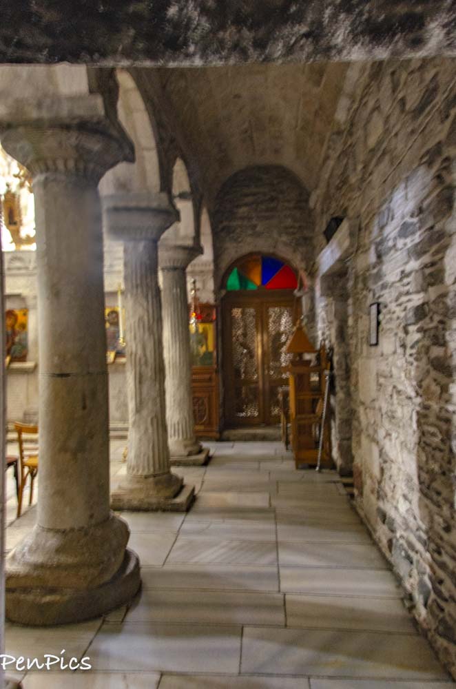 Inside the main church you can still see the two remaining columns from the temple of Artemis on which Ekatontapiliani was built.