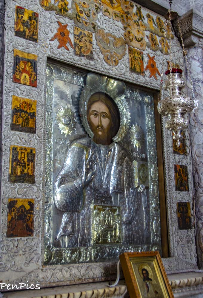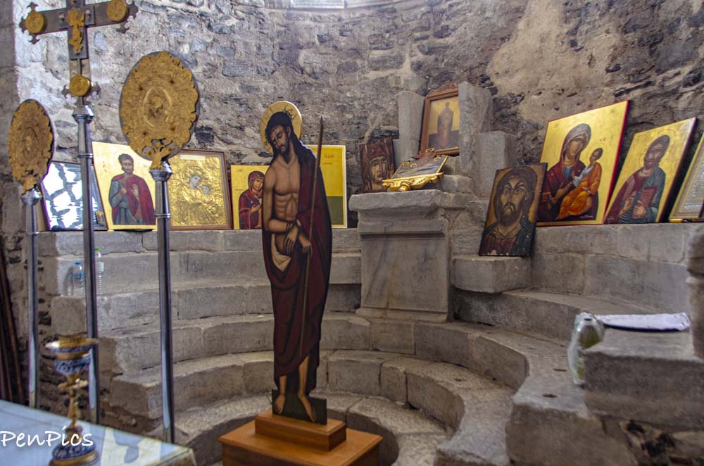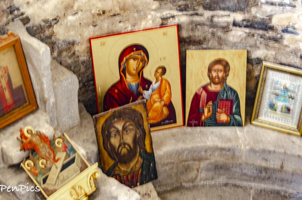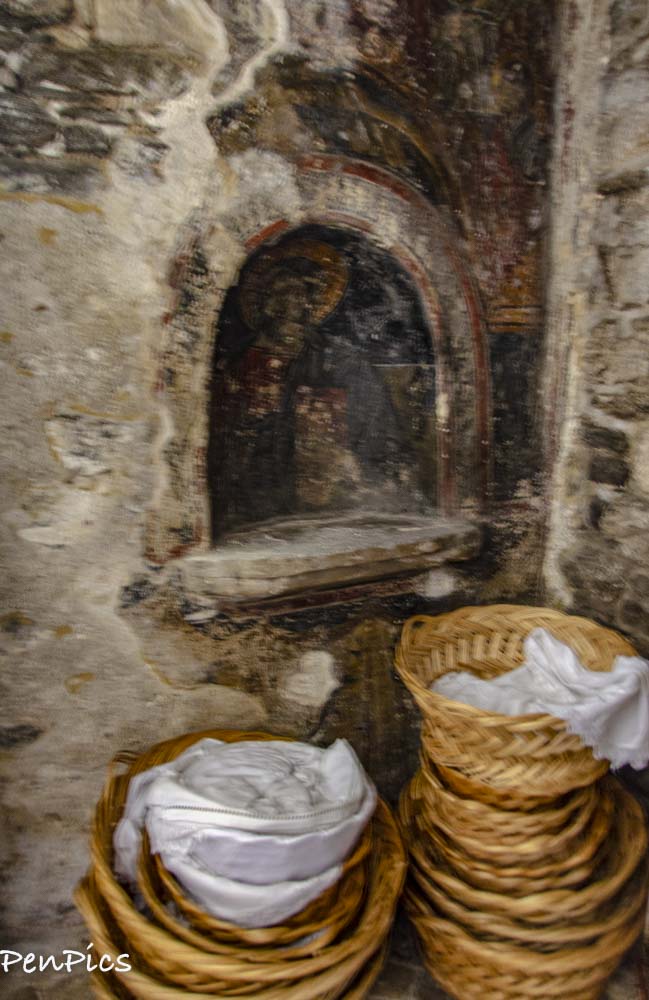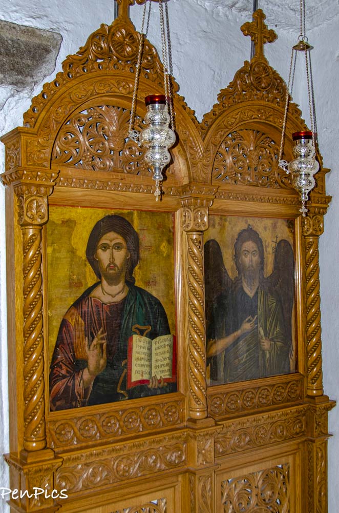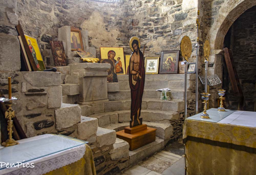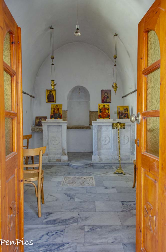Outside the main church, there are the chapels of Agios Nikolaos, Agia Theodosia (who lived and died in this monastery in the 9th century A.D,. and Agios Dimitrios.