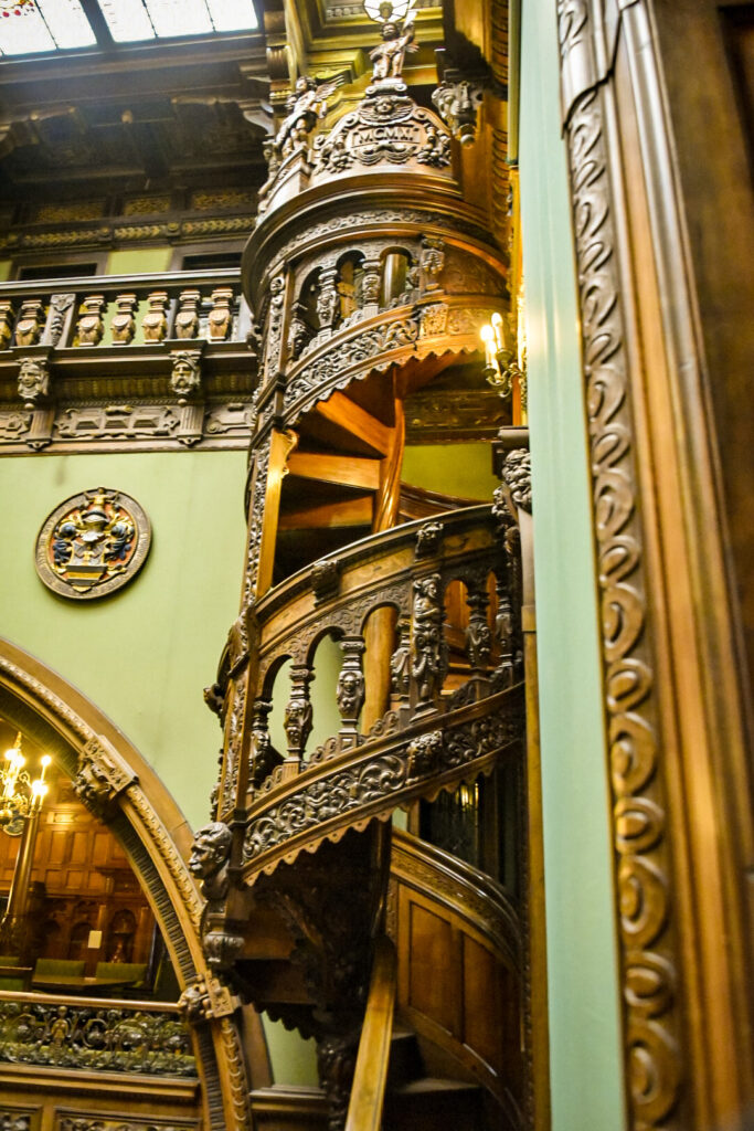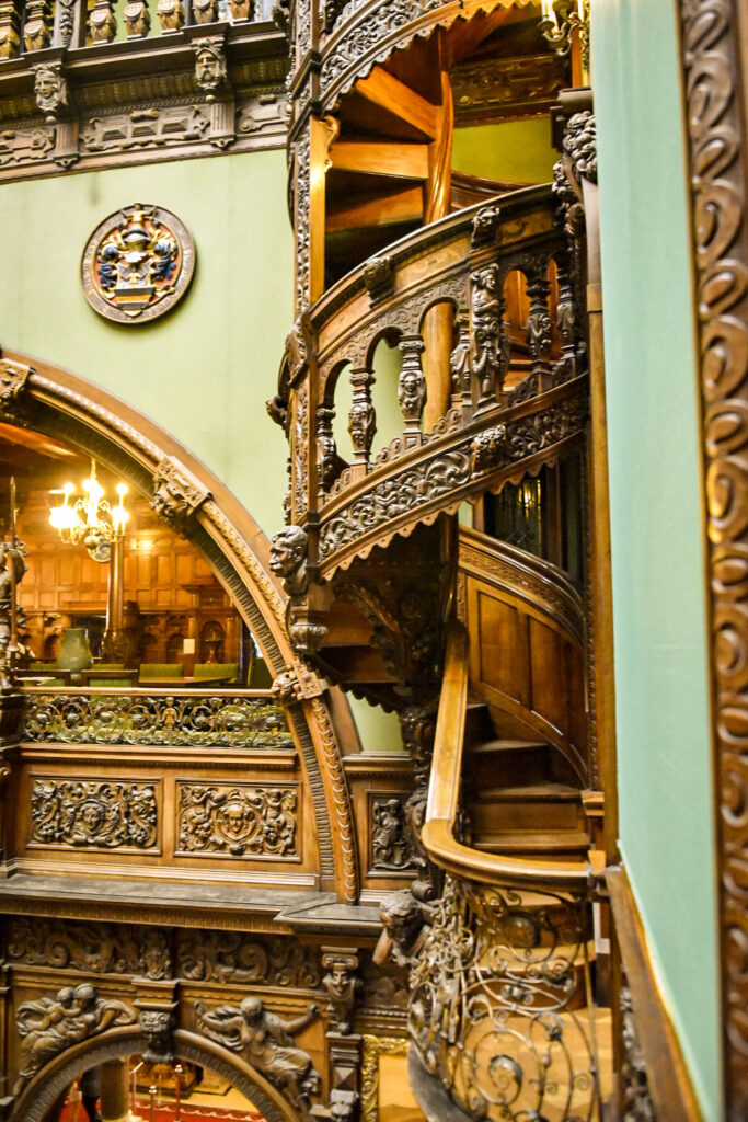 A wooden spiral staircase that was carved out of a single tree serves three stories. It was a copy of one the King knew of in Austria. The architect went to Austria to make blueprints and a native Romanian carved and built this staircase. All other carvings are done by other country craftsmen.