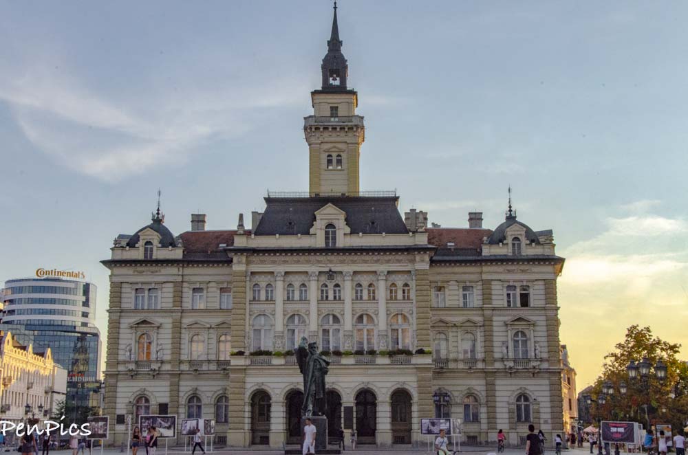The town hall is located in the central square of the city; Trg. Slobode. The architect Georg Molnar made a symbolic building for this city, having four domes; one at each corner and a tower at its top, with a balcony. At the top of the tower, there was a bell that served as a fire alarm. The most visible elements of the facade are the 16 allegorical statues and the Corinthian columns.