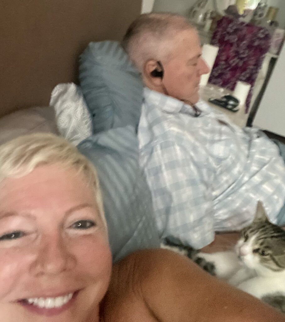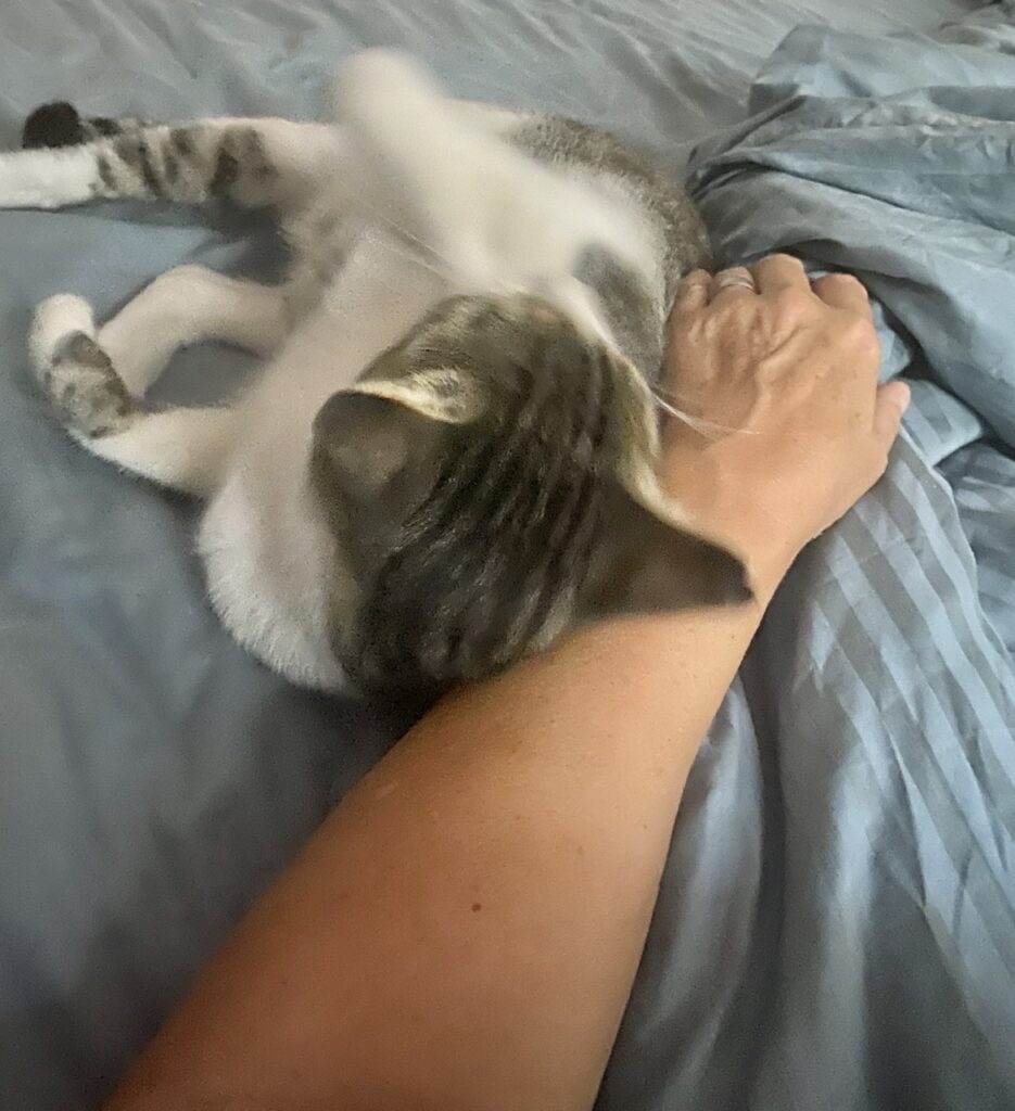 Earlier today, we enjoyed a little nap time. There is a community cat we have named “Nippy,” because she gets so excited when given attention, she gives “love” nips. Oh, and forget any privacy in the bathroom, because she pushes the door open everytine and wants to “visit.”As you can see, she had made herself at home with us. We enjoy getting to “play house” with cats, when we can, because we dearly miss having pets.