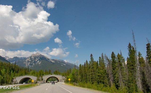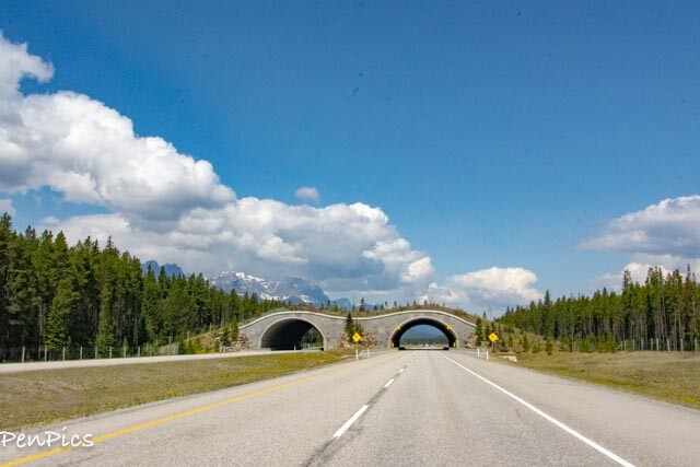 Both sides of the very wide highway have wildlife fences, and many wildlife overpass highway crossings, just for them! The wildlife viewing was nil, along this highway, but that’s okay, since they remain alive, inside that fence!