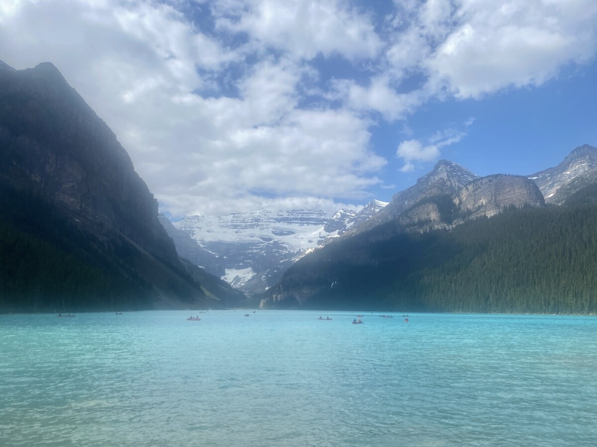 From the vivid turquoise waters to the soaring peaks encircling the lake, Lake Louise is a stunning mountain setting. Fellow adventurers soak in the views from the shore, and bright red canoes float on the glacial waters. It’s hard to resist dipping a hand into the water, just to see if it’s actually real.