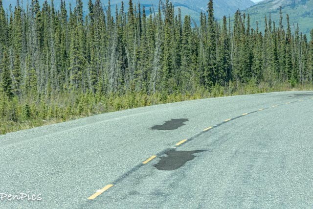 As we neared Destruction Bay, I had eyeballs on the road; we both did. We started seeing fresh asphalt all over, clearly used, recently to fill in, what used to be many, many holes and larger; cross-the-entire-lane drop offs!!!!