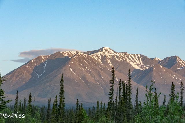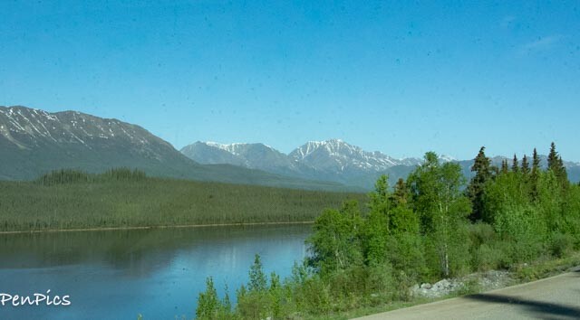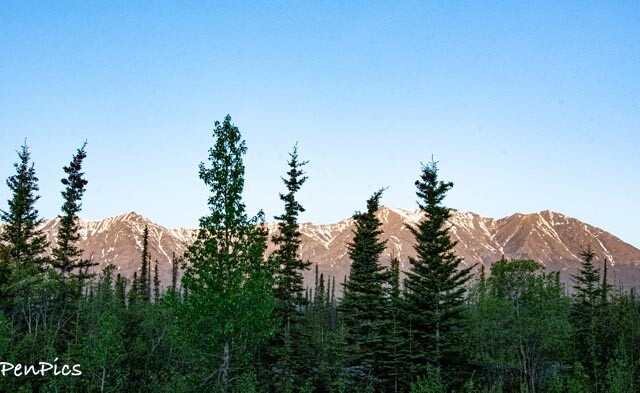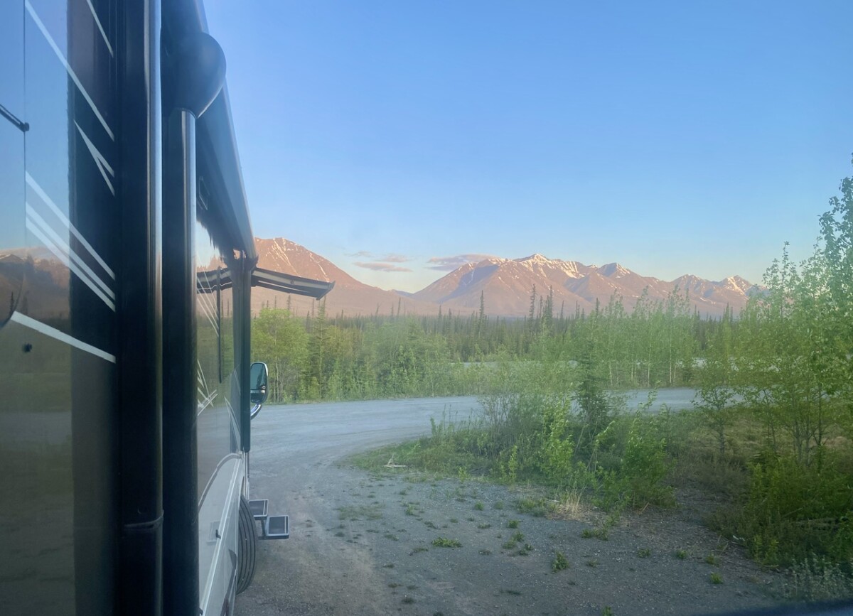 We pulled off at Kuane River Rest area. It has the most amazing view of the mountains! Sunset will be pretty, if we can stay up that late. (It’s staying lighter WAY longer, now). We were the only ones at this stop for the night. Of course we rarely saw any other vehicles, since leaving Whitehorse.