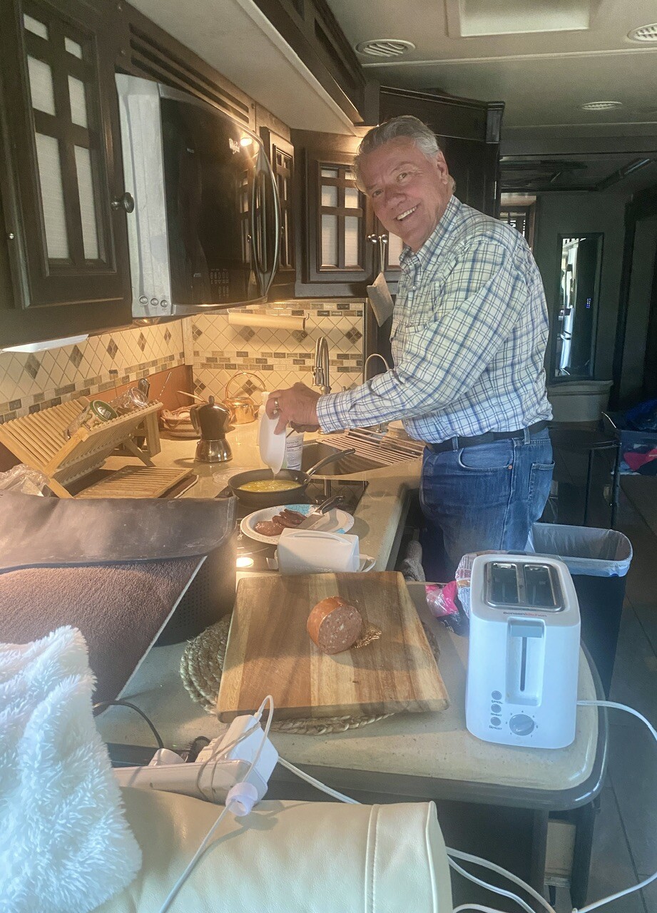 After parking and getting set-up with our auto levelers and putting out, two of our three slides, it was time for dinner! We turned on our generator, and even some A/C. It’s never been this warm, yet.