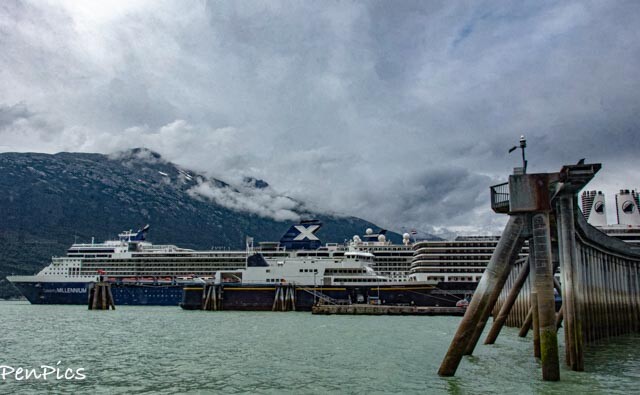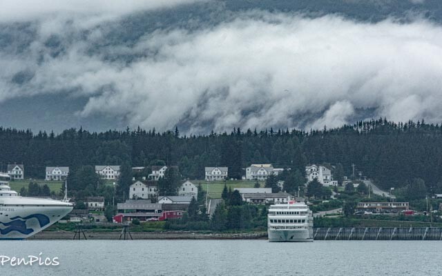 Also, upon arrival, as you can see in the photos, there were three cruise ships in port. That’s a lot of people; and most of the people on our ferry from Haines were coming back from a day-trip, there, and going back to their ships. There was also a very long line of people already at the Skagway harbor, going back to their ships.m; either by tendering or by dock.