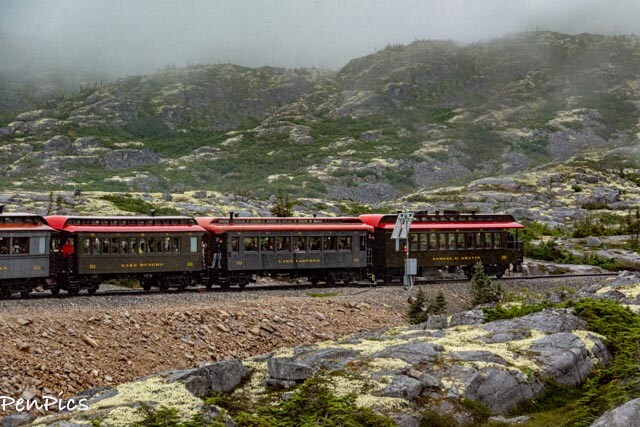 From on the railroad trip, we could see, and pass right by, the Alaska/Canada border crossing, on the ridge. This was the same customs crossing we came through; driving in The Whale, towing Jonah, as we crossed from the Yukon Territory, (after being in Dawson City), to come in to Haines, Alaska.