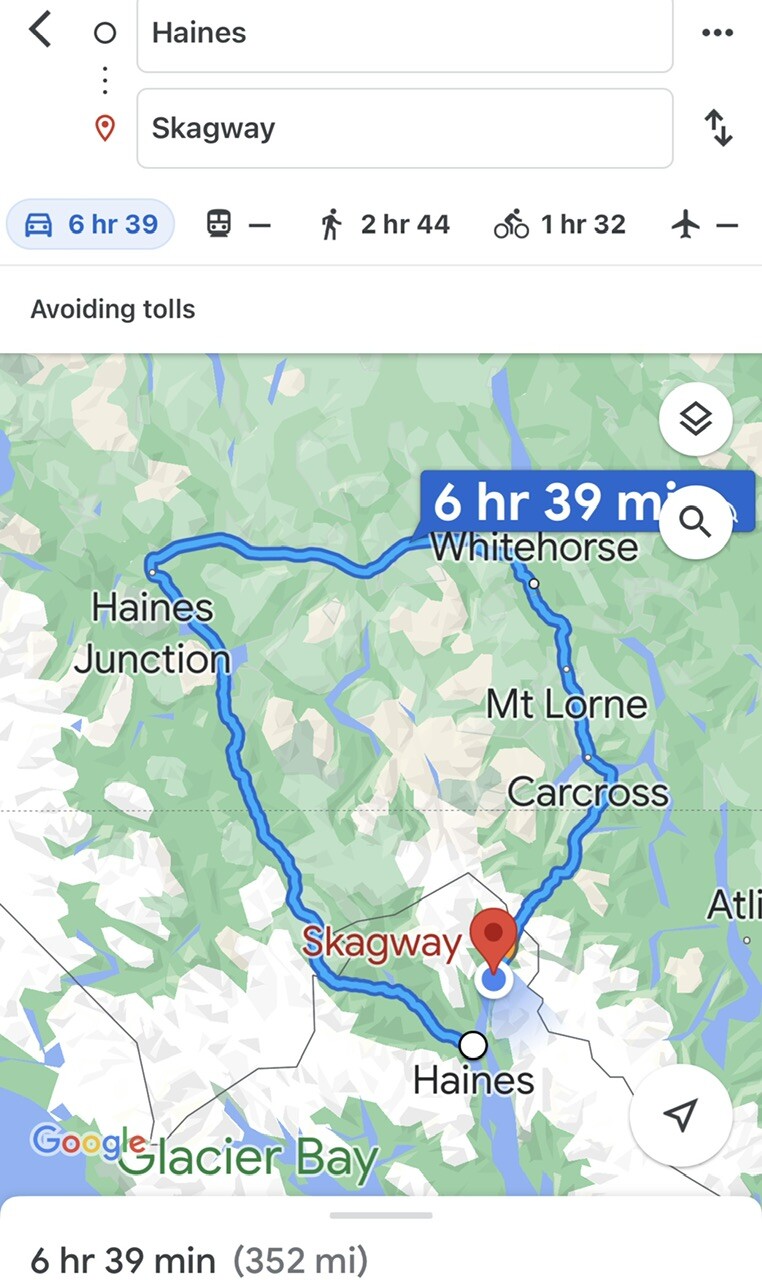 Skagway IS accessible by a driving road and this can be a little confusing, when Haines is “right next door,” yet almost 400 miles away,” at the same time. Here is a map to help: