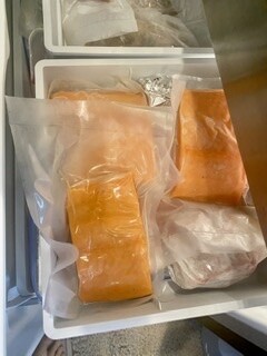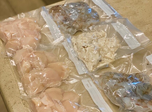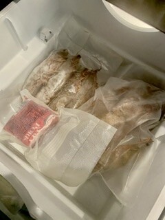 We stocked up on huge shrimp, salmon and scallops. There is no problem bringing back frozen fish.