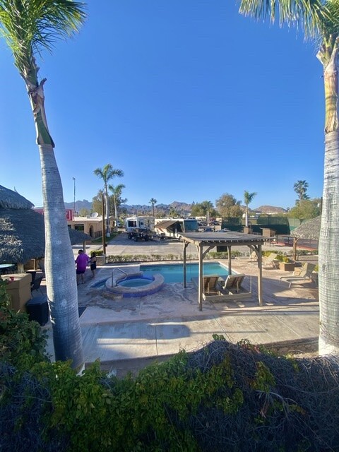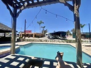 We are now next to the little pool, and on solid concrete, so a very nice break from the dirt pads of dust. The pool has finally warmed up, with the warmer (hotter days)