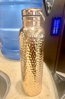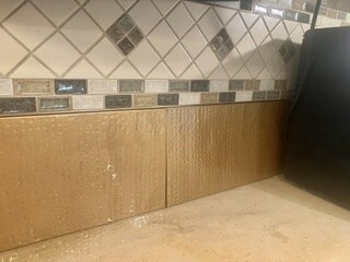 *We had a custom-made back splash done in the kitchen, made out of metal. Originally, we wanted hammered copper plating, but copper is too expensive right now, and not available down here. So, the worker pounded sheet metal for the right look, and instead of installing, we had them just give us the plates. In the USA, we will buy shiny copper spray paint, as well as a lacquer to make it look like copper (my water bottle is the example and the big guy will install. (Daryl had removed a ledge with drawers from in the back of our counter space)