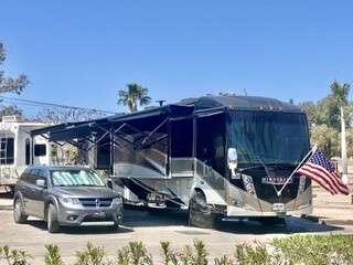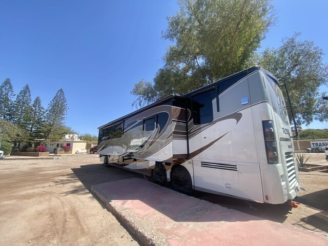 We traveled back to Arizona, filling up with diesel before crossing the border. Going into Nogales, AZ, we had to take a special exit made for RV’s. Bun was driving in front of me. Cars can exit at a place RV’s can’t. Well you can quess she took the way through central Nogales, Mexico, as the maps still did not cooperate. I told her we had to turn around. So we went towards the border and the streets got very narrow. Several Mexicans told me to go left so I did. I went through some very narrow streets and got locked up with parked cars not giving me room. I was inches away from vehicles on both sides. I stopped, and locals came out to help. I helped to push a car forward out of the way. Another neighbor moved his car forward. Two men stood in the back to direct my movements. I made it out and my maps was doing real good, then not. I was on top of a hill with a route down a curved narrow street. No way! I turned around and found myself going under a bridge with an arched top but very narrow with inches on each side. A man stopped his lunch and guided me through the impossible way. So next, I find myself back at the intersection where I was turned around. A man jumped in my coach and guided me through the same streets I went on before, but with one exception. The border is up ahead and I tipped the kind man all the Mexican money I had. ($20.00)