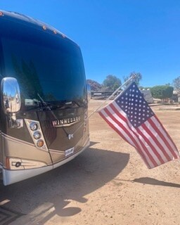 *Daryl got our American flag hanger drilled in. Yes, higher would have been better, but needed the bracket inside to attach to, so it was not just in the fiberglass