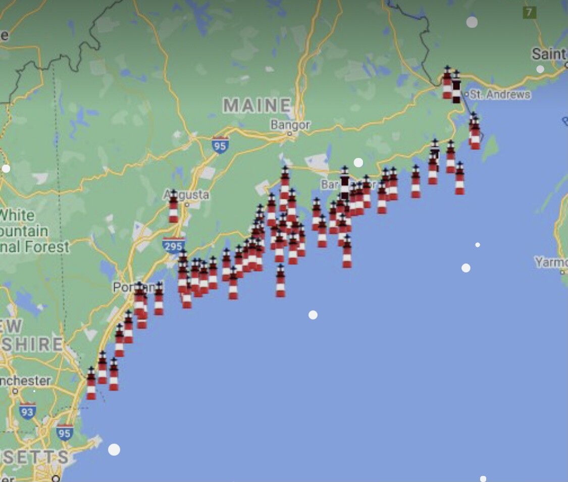 ⬆️ This gives an idea of the coast route we took and are continuing to take, down to Massachusetts. There are a few lighthouses to choose from, and many ports and harbors. It’s the best!