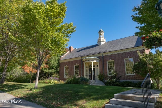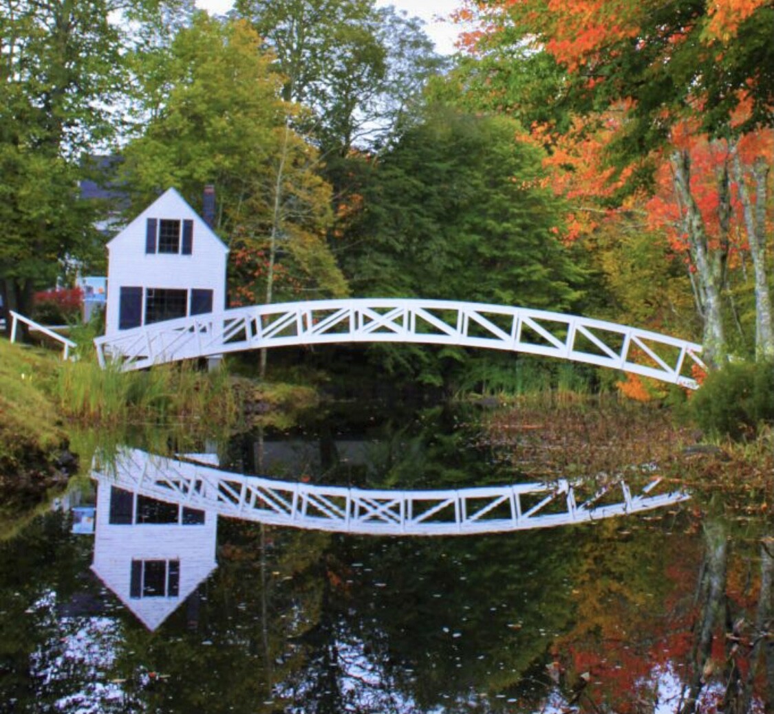 Selectmen’s building (1870) and Thaddeus Somes Memorial bridge reflecting in Summer Pond