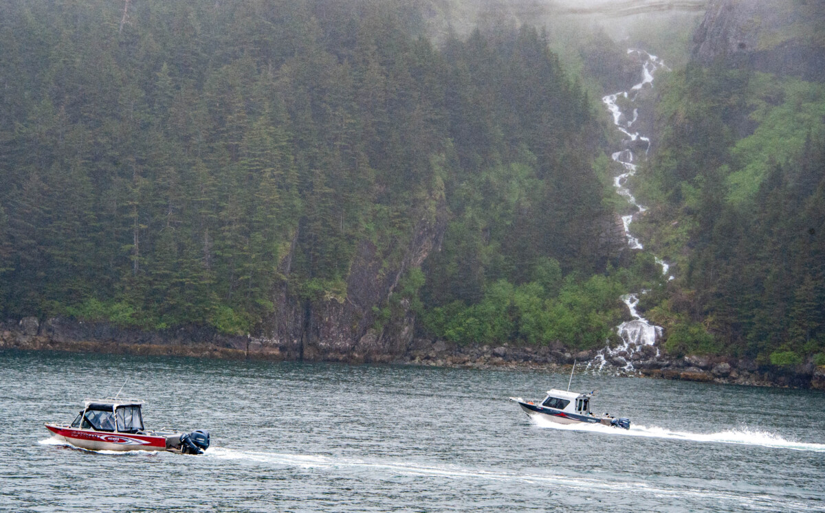 Streams flow with white water as it drops down the steep canyons. A couple of aluminum fishing boats pass by, as a small stream snaking down another canyon came into view.