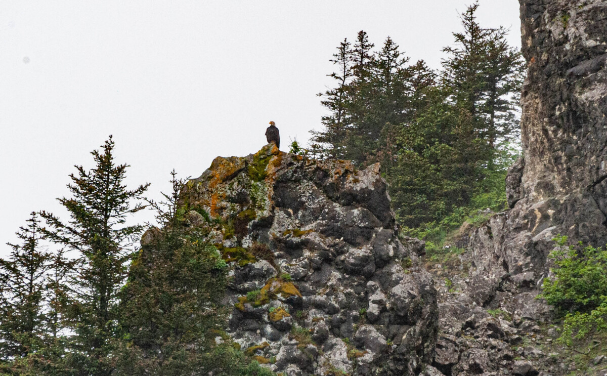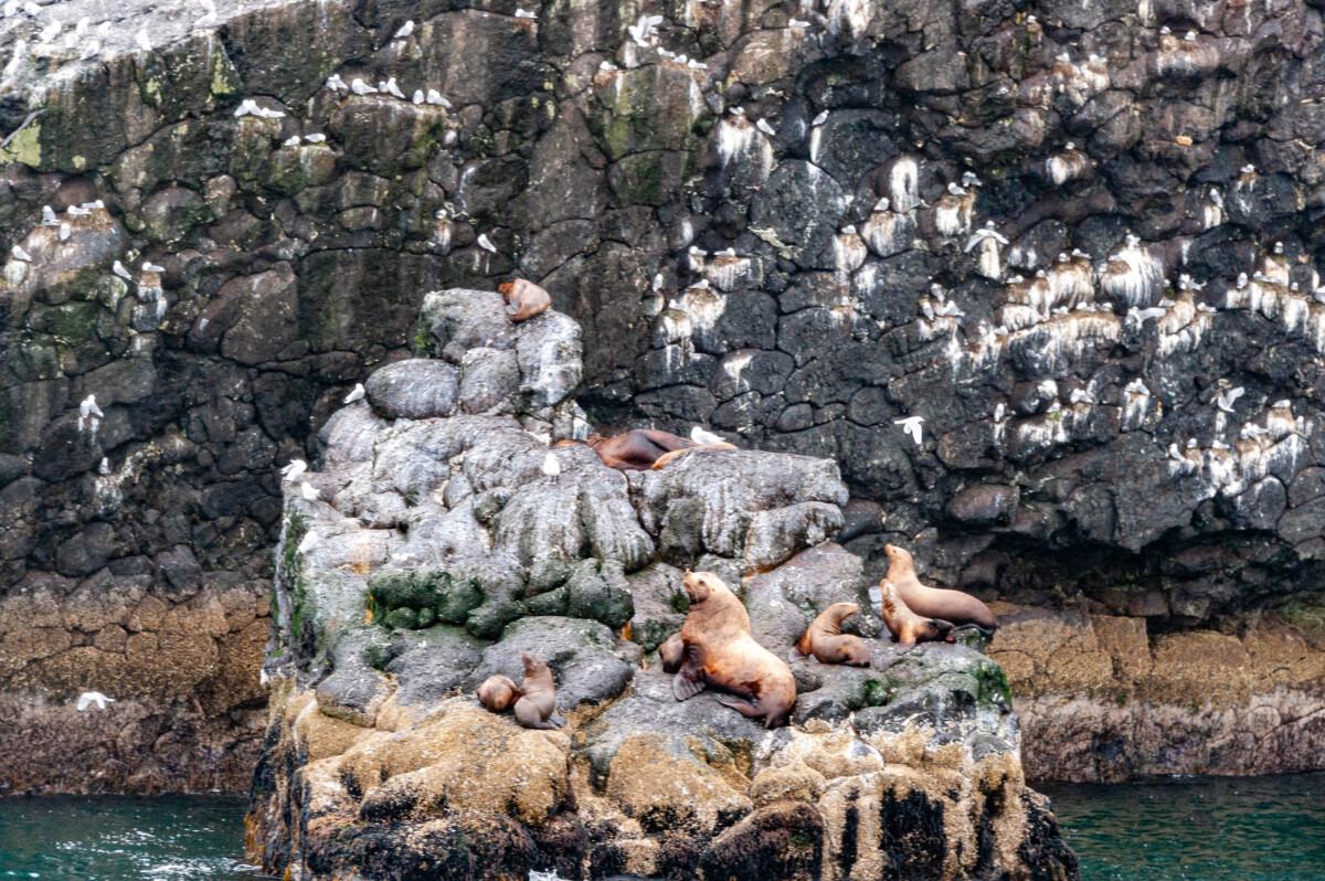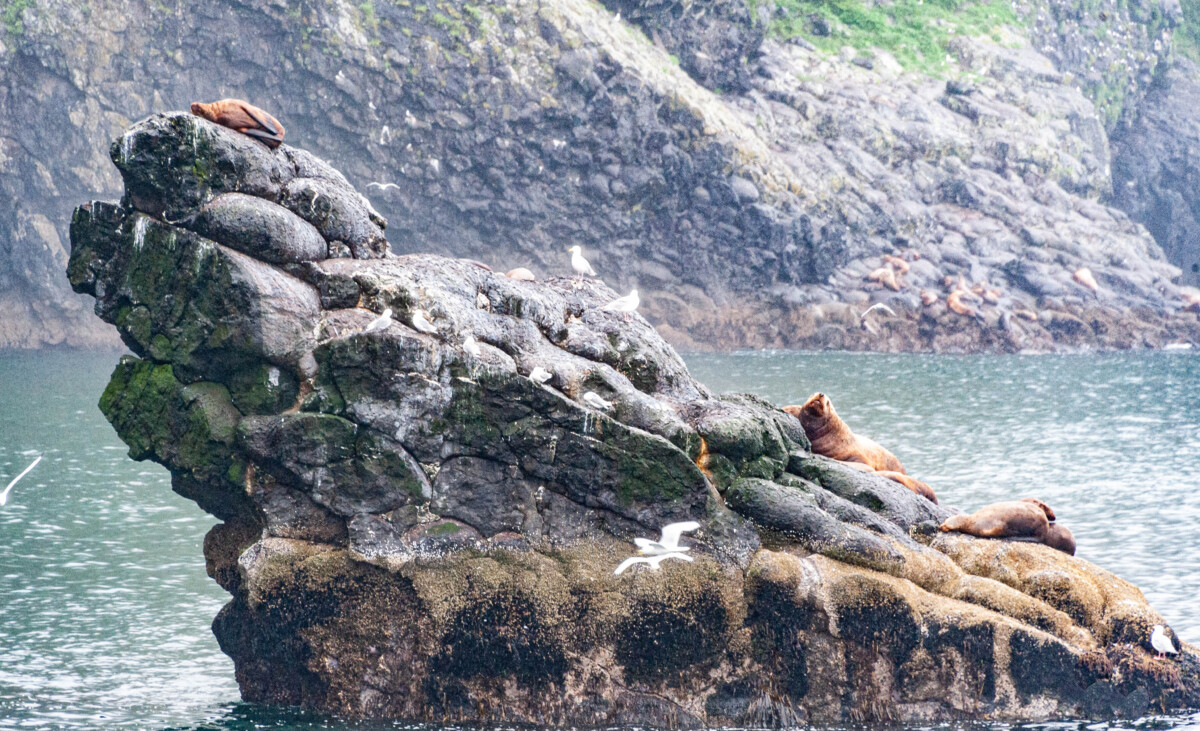 Several Bald Eagles were perched on the tallest trees. Stellar Sea Lions and one lone Harbor Seal rested on huge chunks of the cliff, that at one time had fallen into the water, making small islands.