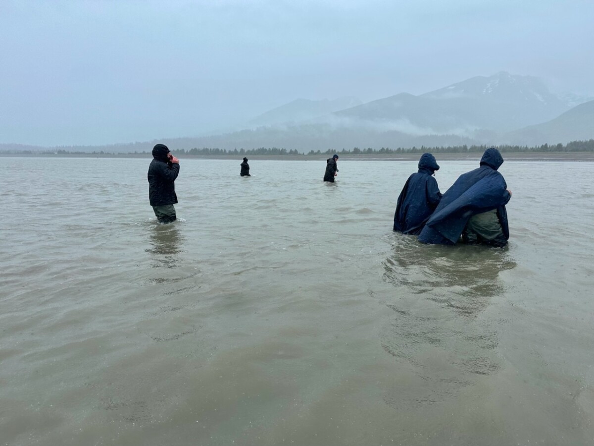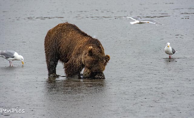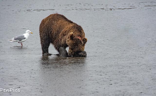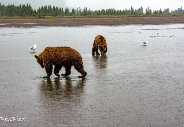 The Grizzly Bears have to eat 90 pounds of food a day, so the rain will not keep them from clamming, but apparently the rain AND wind is where they draw the line.